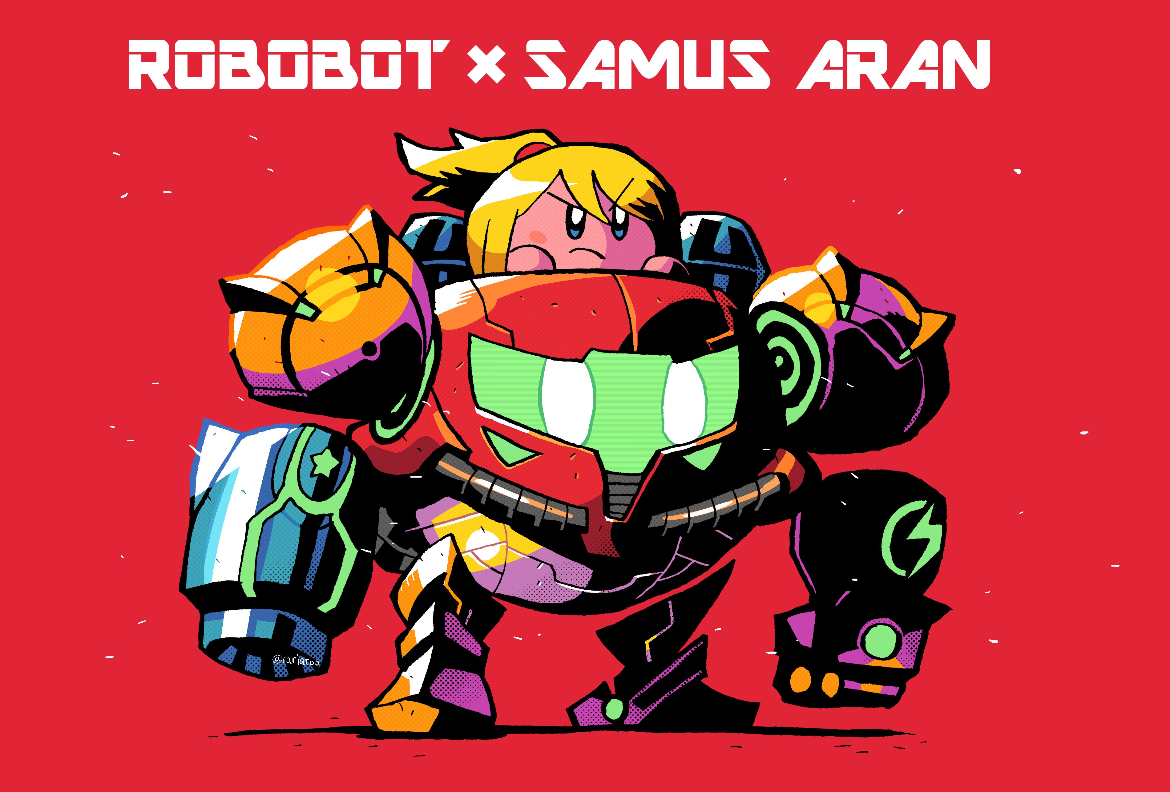 absurdres blonde_hair blue_eyes cosplay crossover frown furrowed_brow highres kirby kirby:_planet_robobot kirby_(series) mecha metroid nintendo ponytail power_suit_(metroid) rariatto_(ganguri) red_background robobot_armor robot samus_aran samus_aran_(cosplay) varia_suit