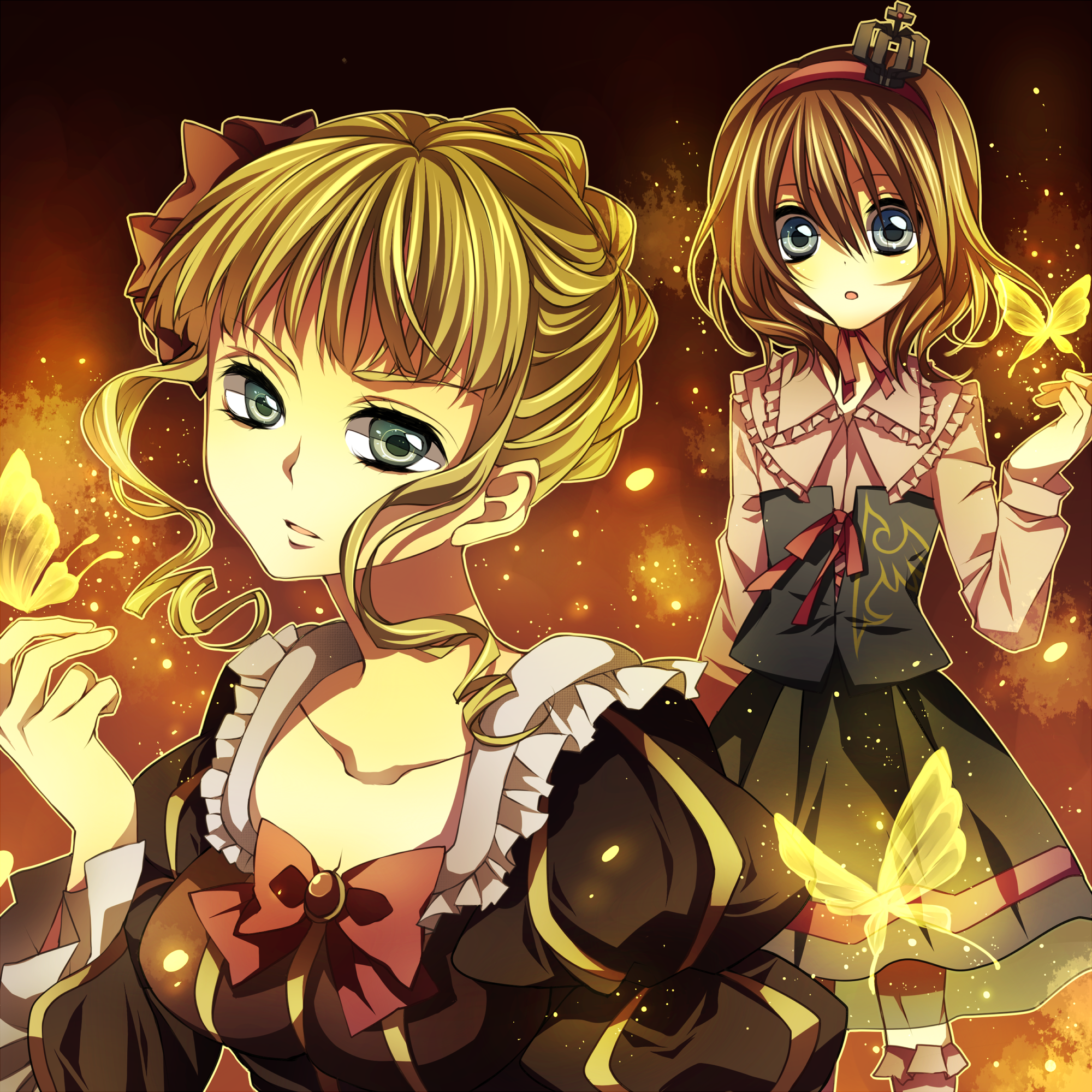 00s 2girls bad_id bad_pixiv_id beatrice_(umineko) blonde_hair blue_eyes bug butterfly crown dress hairband highres insect multiple_girls tsukioka_tsukiho umineko_no_naku_koro_ni ushiromiya_maria