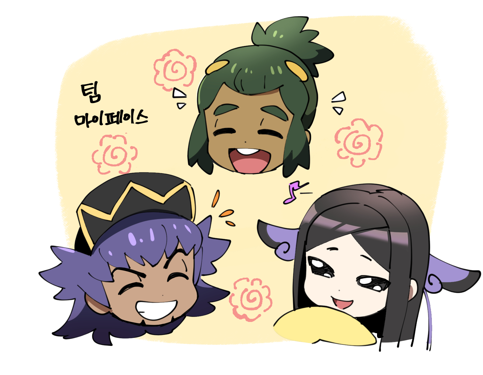 1girl 2boys :d baseball_cap black_hair chibi closed_eyes commentary_request dark-skinned_male dark_skin dede_(qwea_00000) green_hair grin gym_leader hair_ornament hat hau_(pokemon) highres korean_commentary korean_text leon_(pokemon) multiple_boys nintendo open_mouth pokemon pokemon_sun_and_moon pokemon_sword_and_shield pokemon_x_and_y ponytail purple_hair short_ponytail smile teeth tongue upper_teeth_only valerie_(pokemon) |d