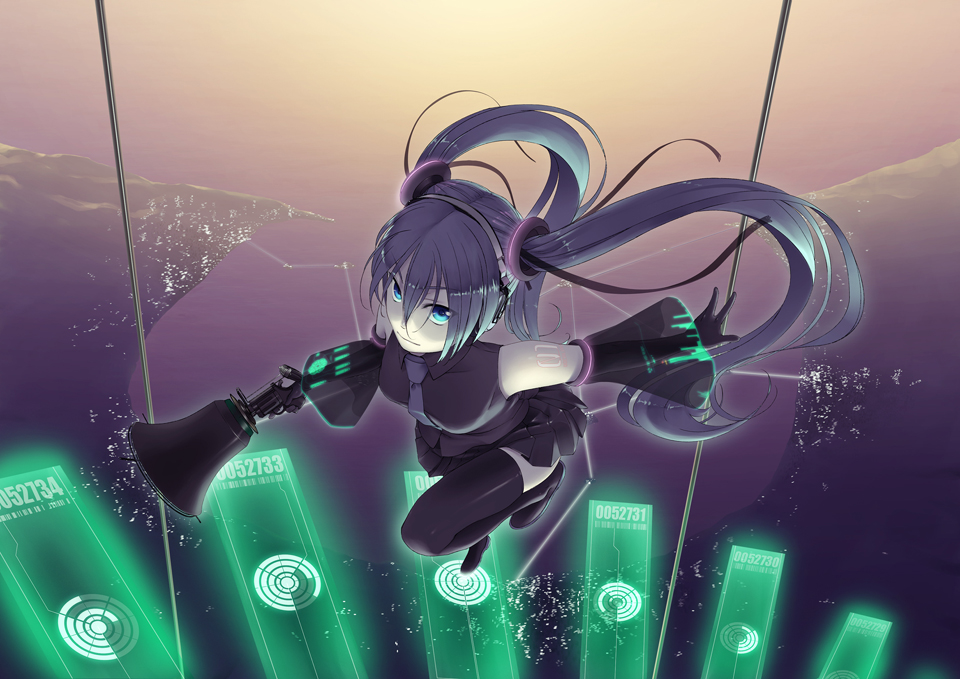 1girl bare_shoulders black_boots black_gloves black_shirt black_skirt blue_eyes blue_hair boots breasts city_lights closed_mouth collared_shirt detached_sleeves female_focus full_body gloves hatsune_miku headphones heibonkaeru holding hologram long_hair long_sleeves looking_at_viewer medium_breasts megaphone necktie ocean outdoors outstretched_arm purple_necktie see-through_clothes shirt shore skirt sleeveless sleeveless_shirt smile solo stairs thigh_boots thighhighs twintails very_long_hair vocaloid water wing_collar zettai_ryouiki