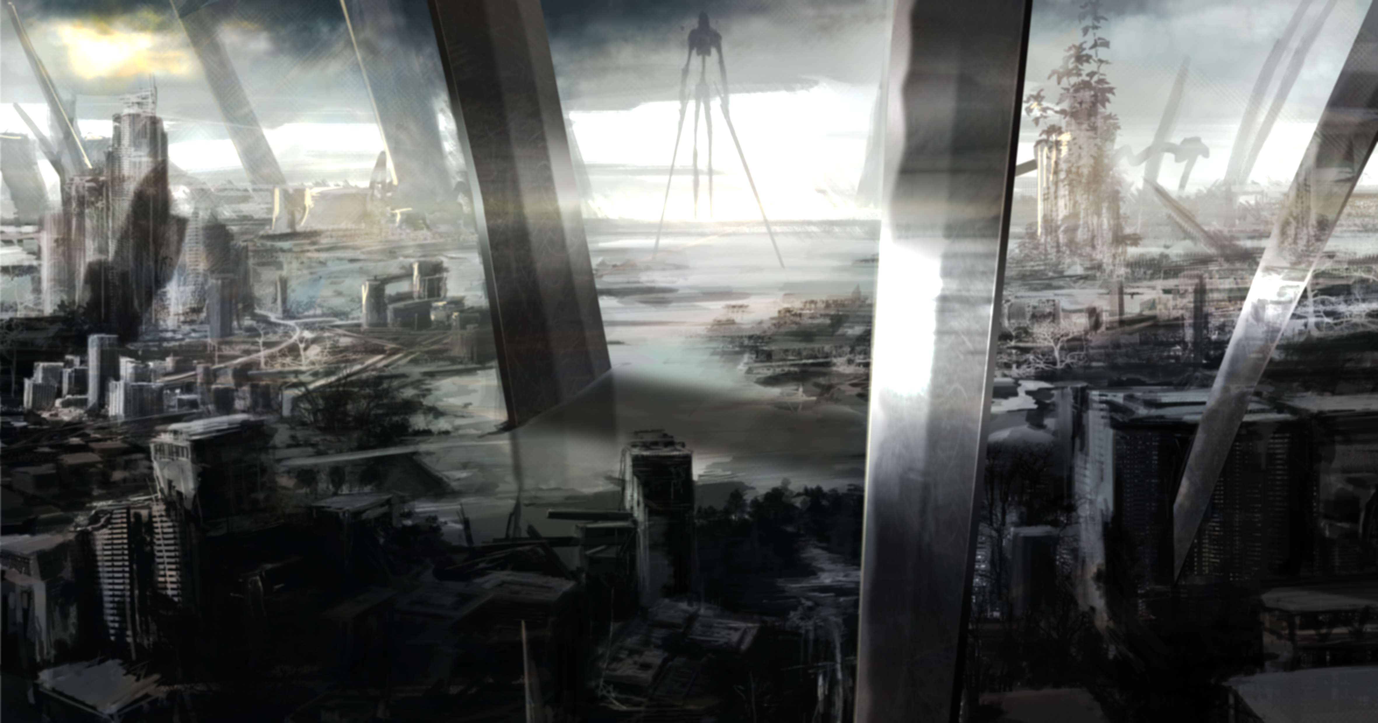 absurdres apocalypse bare_tree building city cityscape cloud cloudy_sky concrete fantasy giant giant_tree grey_sky highres light no_humans non-humanoid_robot ocean original pajaman pillar reflection robot ruins scenery science_fiction shadow shore sky skyscraper sunlight tower toy_block tree