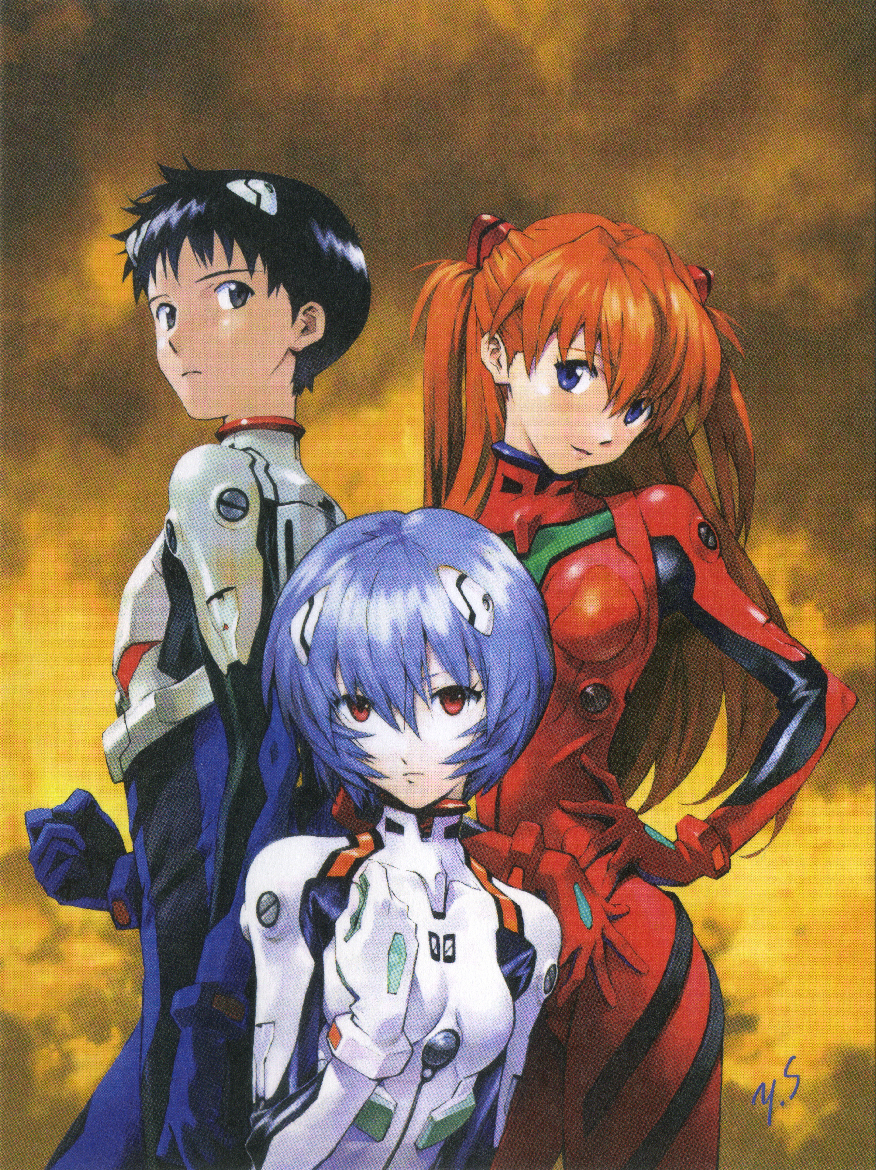 1boy 2girls absurdres ayanami_rei black_hair blue_bodysuit blue_hair bodysuit brown_background color_halftone hair_between_eyes hand_on_own_hip highres huge_filesize ikari_shinji interface_headset_(evangelion) looking_at_viewer looking_back mecha_pilot_suit multiple_girls neon_genesis_evangelion neon_genesis_evangelion_(manga) official_art orange_hair plugsuit_(evangelion) red_bodysuit sadamoto_yoshiyuki scan signature souryuu_asuka_langley white_bodysuit