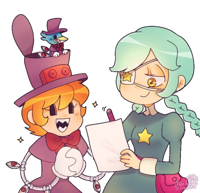 2girls annie_(skullgirls) avery_(skullgirls) belt_pouch bird braid cyborg dress eyepatch gloves green_hair hat holding interlocked_fingers juliet_sleeves long_sleeves marika_sornnucha multiple_girls open_mouth orange_hair peacock_(skullgirls) pencil pouch puffy_sleeves sharp_teeth short_hair skirt skullgirls smile sparkle teeth top_hat twin_braids upper_body white_background writing yellow_eyes