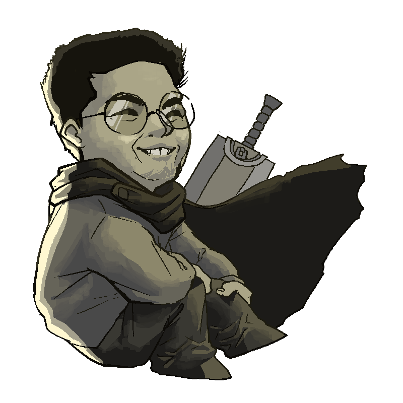 1boy ^_^ berserk chibi closed_eyes cosplay closed_eyes facial_hair guts_(berserk) guts_(berserk)_(cosplay) hair_behind_ear hand_on_own_knee miura_kentarou_(mangaka) pants porpoise. real_life round_eyewear scarf sitting smile solo stubble sweater sword tooth_gap weapon white_background