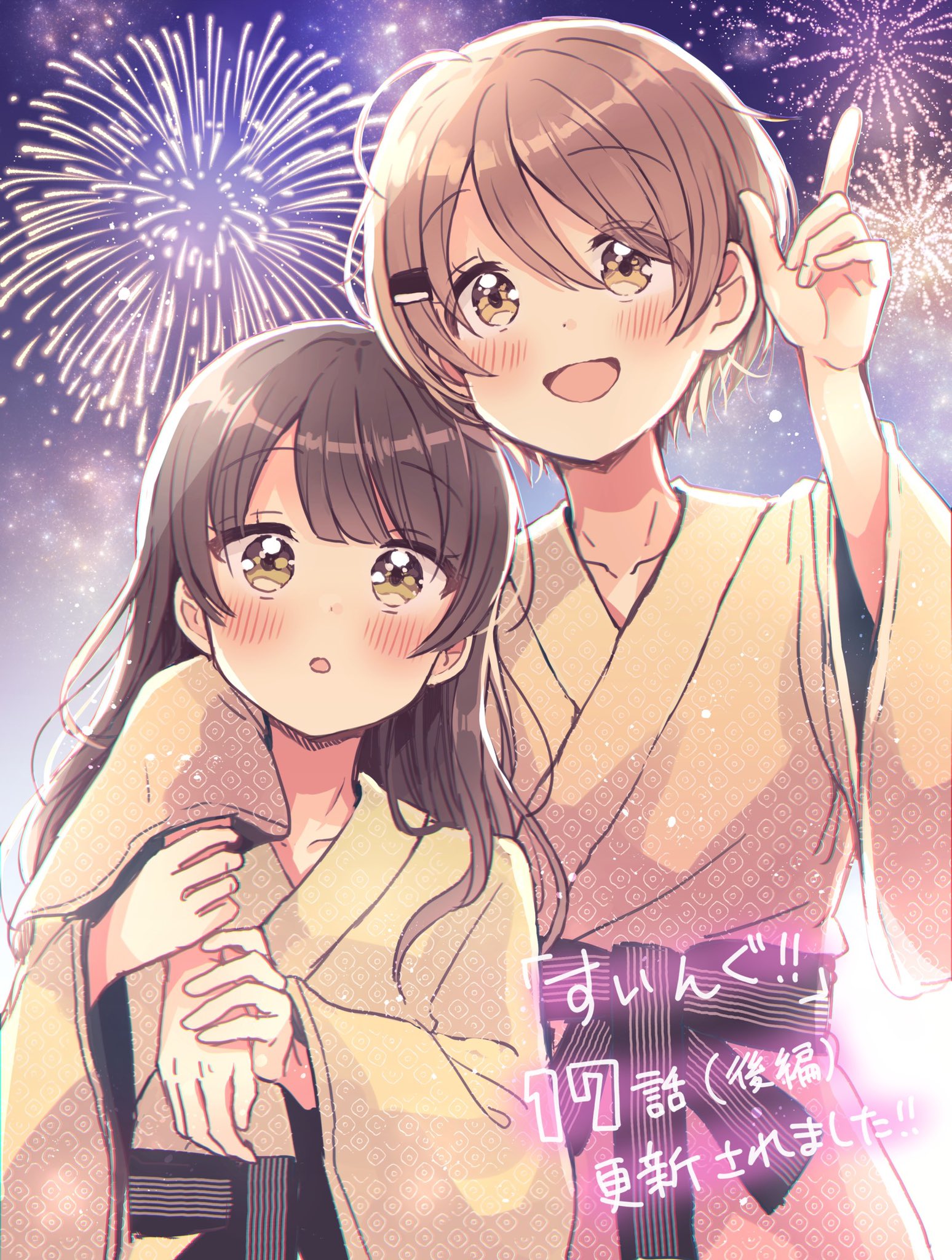 2girls :d :o aerial_fireworks arm_around_neck blush brown_eyes brown_hair brown_kimono collarbone commentary_request fireworks hair_between_eyes hair_ornament hairclip hand_up highres index_finger_raised japanese_clothes kimono long_hair long_sleeves multiple_girls night obi open_mouth outdoors parted_lips sakura_oriko sash short_hair smile swing!! translation_request wide_sleeves