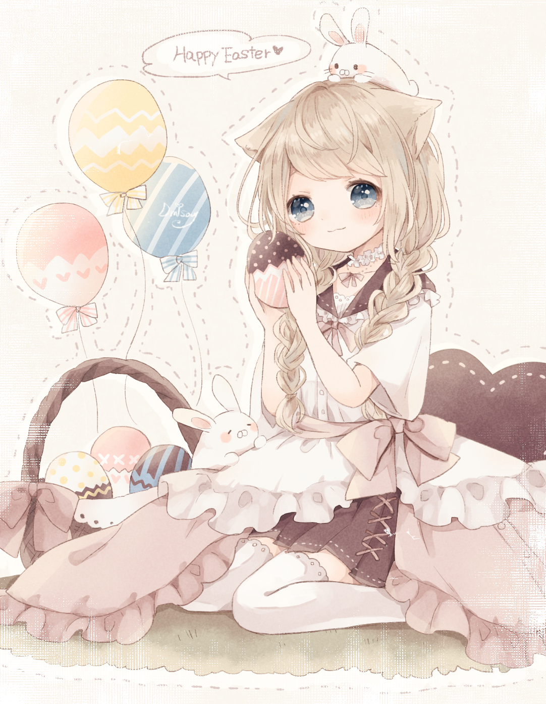 1girl animal animal_ears animal_on_head apron balloon basket black_sailor_collar black_skirt blue_eyes blush braid brown_background brown_hair cat_ears closed_mouth commentary_request commission dotted_line easter easter_egg egg eyebrows_hidden_by_hair frilled_apron frills hair_over_shoulder hands_up highres holding holding_egg long_hair looking_at_viewer on_head original pixiv_commission pleated_skirt rabbit sailor_collar school_uniform serafuku shirt sitting skirt smile solo thighhighs tukimisou0225 twin_braids twintails very_long_hair wariza white_apron white_shirt white_thighhighs