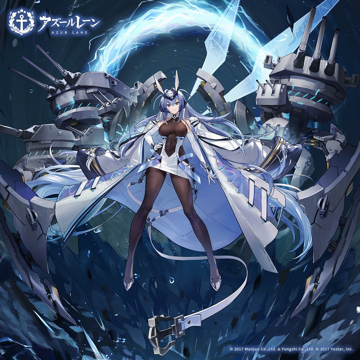 1girl :3 artist_request azur_lane bare_shoulders black_pantyhose blue_eyes blue_hair bodystocking breasts commentary_request dress eagle_union_(emblem) elbow_gloves gloves hair_intakes headgear highres large_breasts long_hair looking_at_viewer new_jersey_(azur_lane) official_art pantyhose promotional_art rigging ship_turret sleeveless sleeveless_dress very_long_hair white_gloves