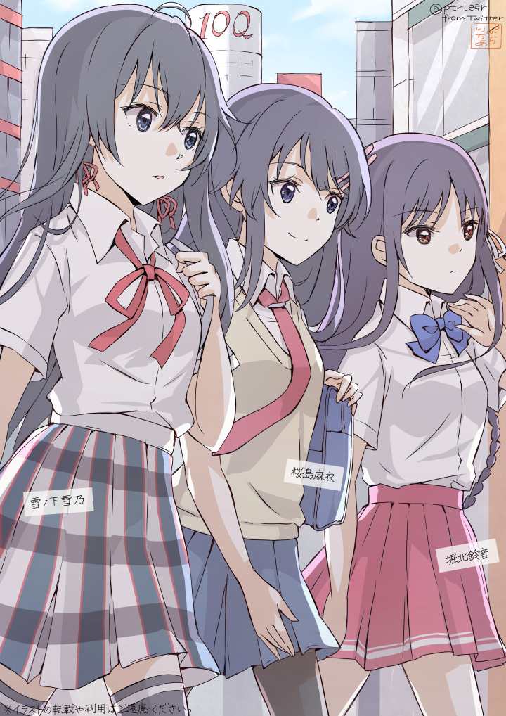 3girls advanced_nurturing_high_school_uniform artist_name bag black_hair black_legwear blue_bow blue_eyes blue_skirt bow bowtie braid brown_eyes character_name commentary_request crossover hair_ornament hair_ribbon hairclip holding holding_bag horikita_suzune long_hair multiple_crossover multiple_girls outdoors plaid_clothes plaid_skirt pleated_skirt ptrtear red_neckwear red_ribbon red_skirt ribbon sakurajima_mai school_bag school_uniform seishun_buta_yarou shirt short_sleeves skirt sky sobu_high_school_uniform sweater_vest translation_request twitter_username walking watermark white_ribbon white_shirt yahari_ore_no_seishun_lovecome_wa_machigatteiru. yellow_sweater_vest youkoso_jitsuryoku_shijou_shugi_no_kyoushitsu_e yukinoshita_yukino