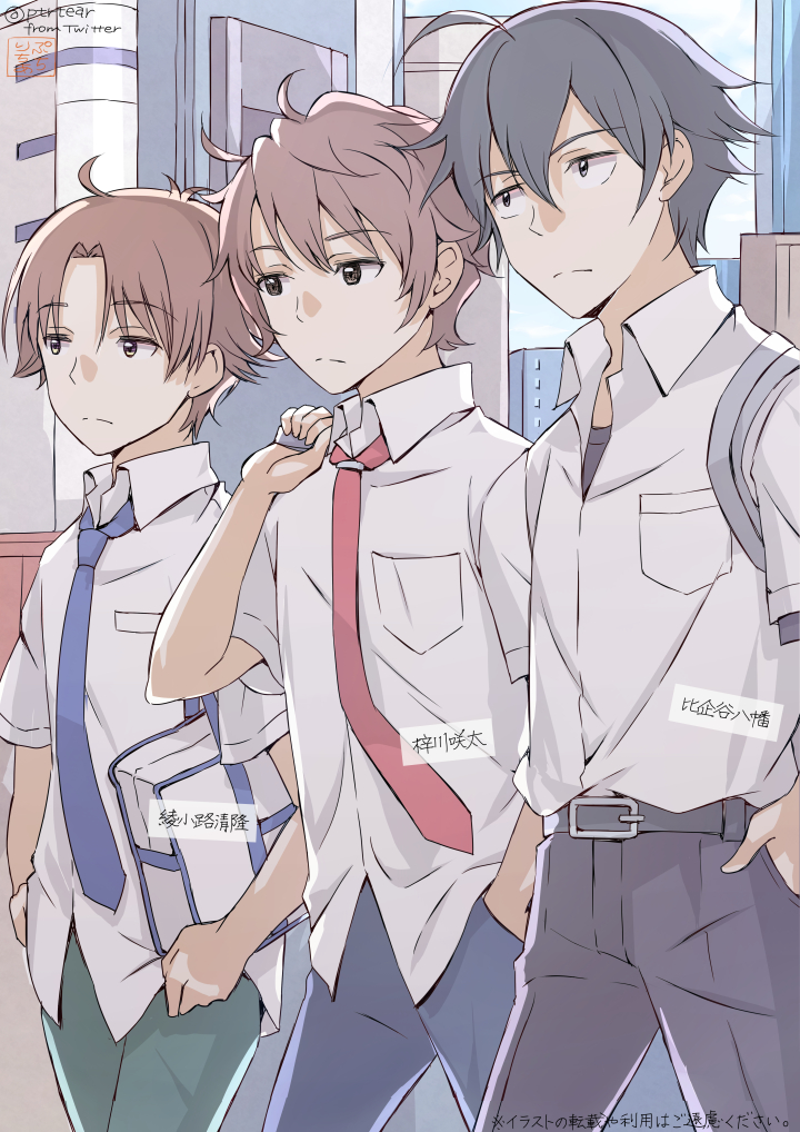 3boys advanced_nurturing_high_school_uniform artist_name ayanokouji_kiyotaka azusagawa_sakuta bag belt black_eyes black_hair blue_neckwear blue_pants brown_eyes brown_hair character_name closed_mouth commentary_request crossover green_pants hand_in_pocket hand_on_own_hip hands_on_own_hips hikigaya_hachiman holding holding_bag male_focus multiple_boys multiple_crossover necktie outdoors pants ptrtear red_neckwear school_bag school_uniform seishun_buta_yarou shirt short_sleeves sky sobu_high_school_uniform swept_bangs translation_request twitter_username untucked_shirt walking watermark white_shirt yahari_ore_no_seishun_lovecome_wa_machigatteiru. youkoso_jitsuryoku_shijou_shugi_no_kyoushitsu_e