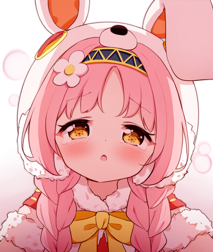 1girl animal_ears animal_hat black_hairband blush bow braid brown_eyes capelet chestnut_mouth commentary_request fake_animal_ears flower fur-trimmed_capelet fur_trim gradient_background hair_flower hair_ornament hairband half-closed_eyes hat long_hair looking_at_viewer mimi_(princess_connect!) parted_bangs parted_lips pink_capelet pink_hair princess_connect! rabbit_ears rabbit_hat setmen solo tears twin_braids twintails upper_body white_flower white_headwear yellow_bow