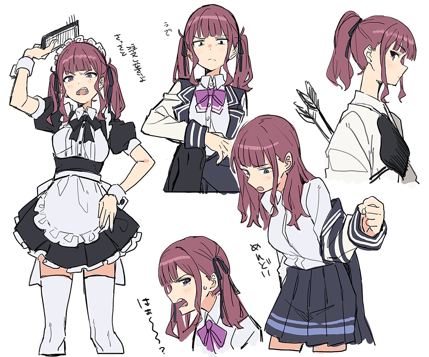 1girl angry annoyed apron arm_up arrow_(projectile) black_dress black_ribbon blazer blue_jacket bow bowtie commentary dot_pupils dress dressing frilled_dress frills frown hair_ribbon highres holding holding_notepad jacket japanese_clothes maid maid_apron maid_headdress medium_hair multiple_views muneate natsuki_karin notepad open_mouth ponytail purple_eyes purple_neckwear red_hair ribbon robe school_uniform shirt short_sleeves sideways_glance sketch synthesizer_v teshima_nari thighhighs translated twintails white_robe white_shirt white_thighhighs wrist_cuffs zettai_ryouiki