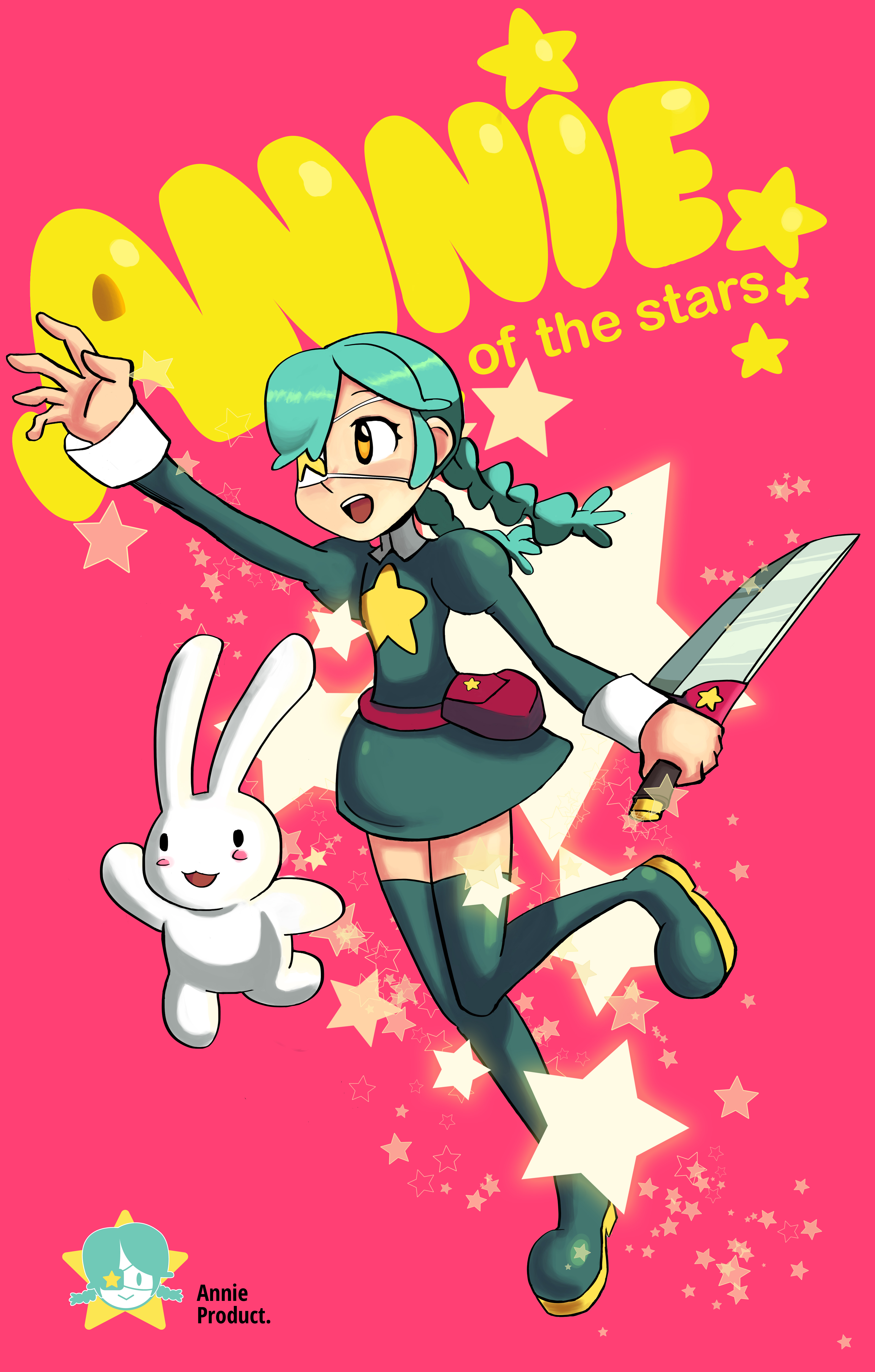1girl absurdres annie_(skullgirls) arm_up boots braid character_name eyepatch green_hair highres holding holding_weapon nutria open_mouth pink_background sagan_(skullgirls) skirt skullgirls solo star_(symbol) stuffed_animal stuffed_rabbit stuffed_toy thigh_boots thighhighs twin_braids waving weapon yellow_eyes