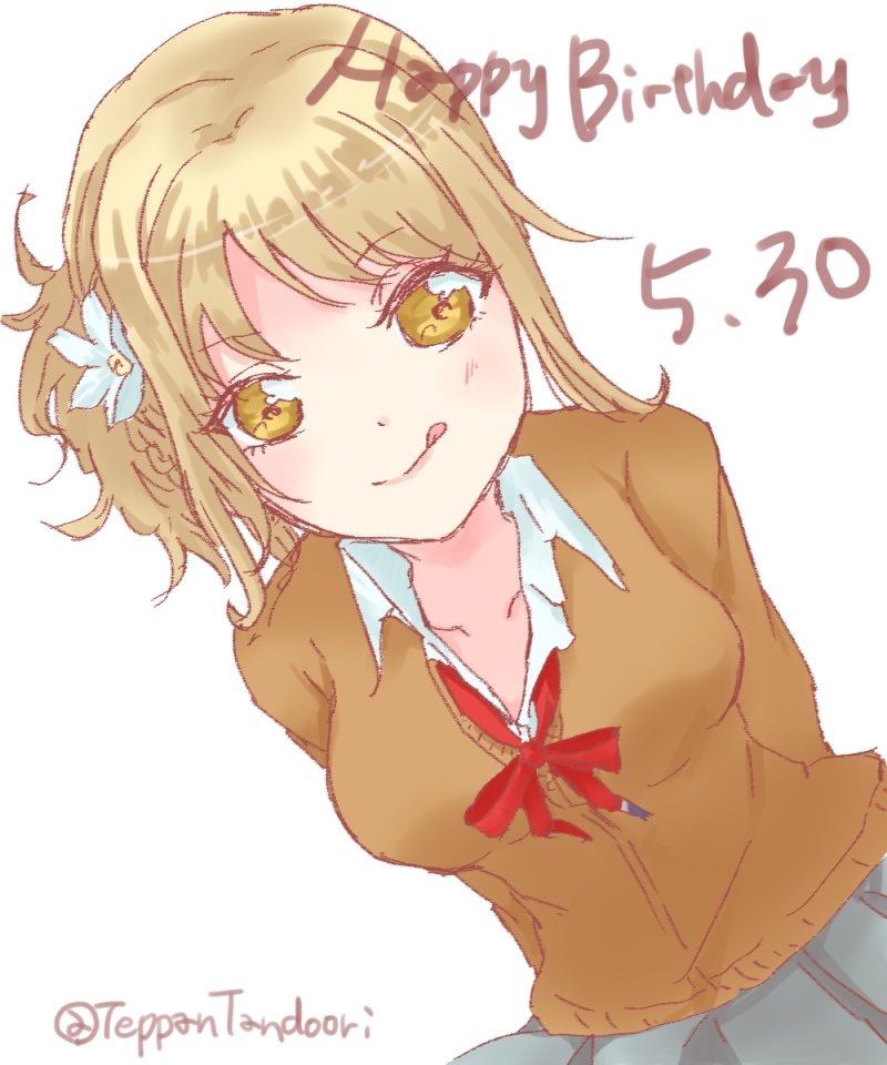 1girl :p arms_behind_back artist_name artist_request blonde_hair blush bow bowtie breasts brown_cardigan brown_eyes brown_jacket buttons cardigan checkered_clothes checkered_skirt cleavage collarbone collared_shirt female_focus flower hair_between_eyes hair_flower hair_ornament half_updo high_ponytail jacket long_hair long_sleeves looking_at_viewer love_live! love_live!_nijigasaki_high_school_idol_club medium_breasts miniskirt miyashita_ai neck_ribbon nijigasaki_school_uniform orange_eyes parted_lips plaid_clothes plaid_skirt pleated pleated_skirt ponytail red_ribbon ribbon school_uniform shirt side_ponytail sidelocks skirt smile solo tongue tongue_out white_background white_flower white_shirt white_skirt yellow_eyes