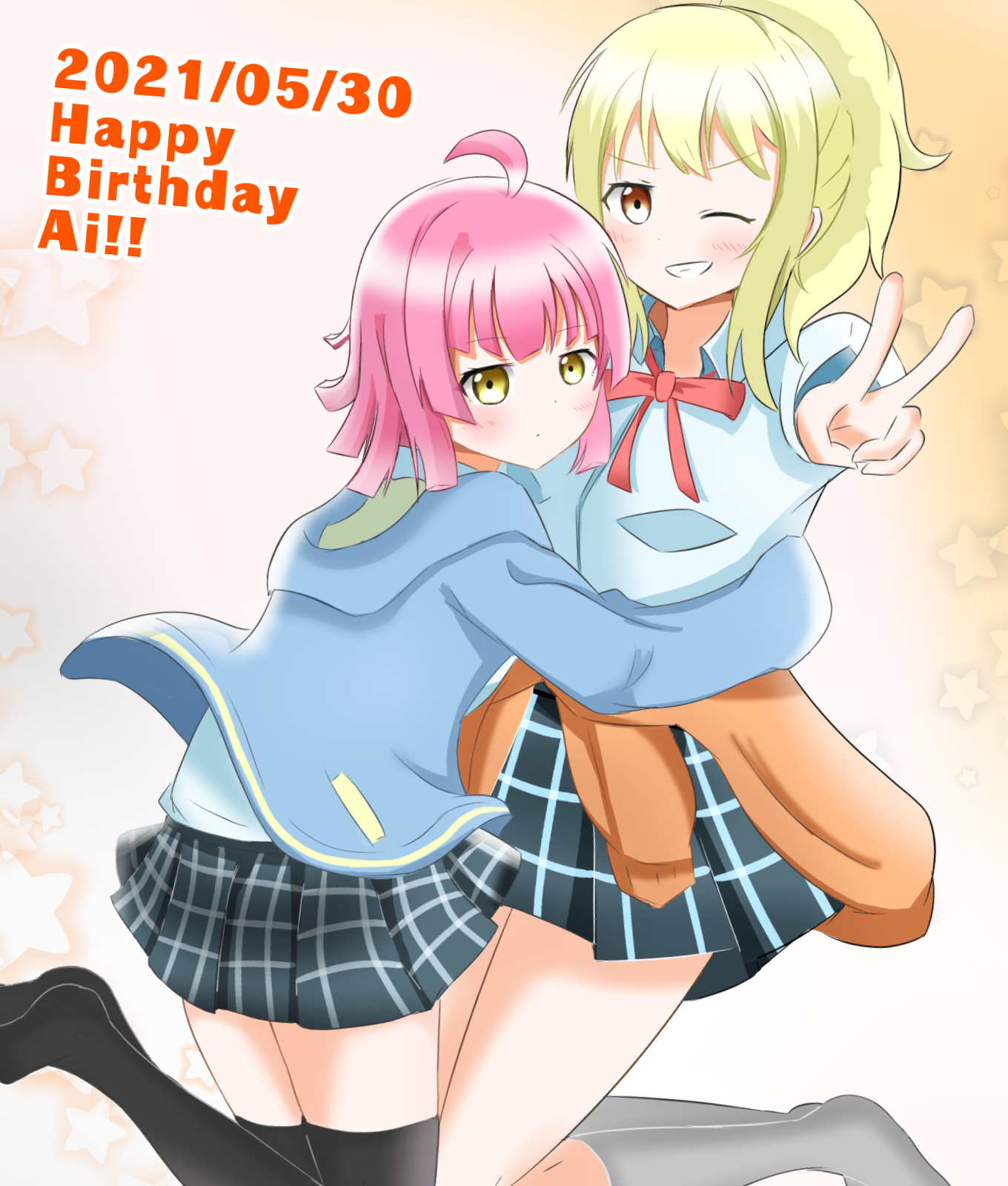 2girls ;) aqua_cardigan aqua_jacket aqua_scrunchie aqua_shirt artist_name artist_request bare_legs black_legwear black_skirt blonde_hair blue_shirt blue_skirt blush bow bowtie bracelet braid breasts brown_cardigan brown_eyes brown_jacket cardigan cardigan_around_waist checkered_clothes checkered_skirt clothes_around_waist collarbone collared_shirt dress_shirt female_focus flower full_body grey_legwear hair_between_eyes hair_flower hair_ornament half_updo high_ponytail highres hood hood_down hooded_jacket hoodie hug jacket jacket_around_waist jewelry long_hair looking_at_viewer love_live! love_live!_nijigasaki_high_school_idol_club medium_breasts miniskirt miyashita_ai multiple_girls neck_ribbon nijigasaki_school_uniform one_eye_closed orange_eyes parted_lips pink_bow pink_ribbon plaid_clothes plaid_skirt pleated pleated_skirt ponytail ribbon school_uniform scrunchie shirt short_ponytail short_sleeves side_ponytail sidelocks skirt smile star_(symbol) star_print summer_uniform sweater sweater_around_waist teeth v v-shaped_eyebrows white_flower white_shirt wrist_scrunchie yellow_eyes yellow_scrunchie