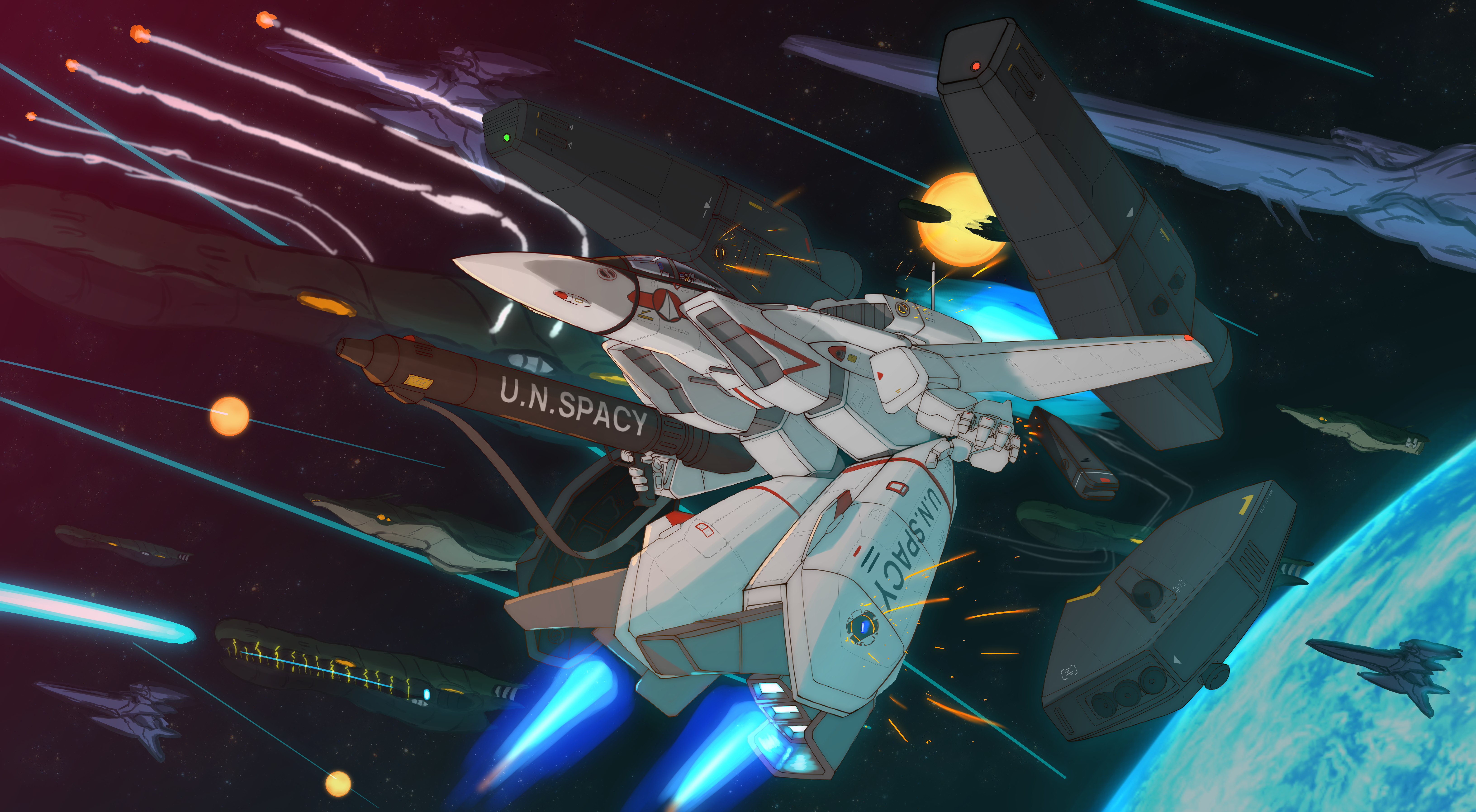 absurdres choujikuu_yousai_macross earth_(planet) explosion firing flying gerwalk gun highres holding holding_gun holding_weapon huge_filesize irino_hakkei macross macross:_do_you_remember_love? mecha open_hand planet robot science_fiction smoke solo space spacecraft variable_fighter vehicle_request vf-1 vf-1s weapon