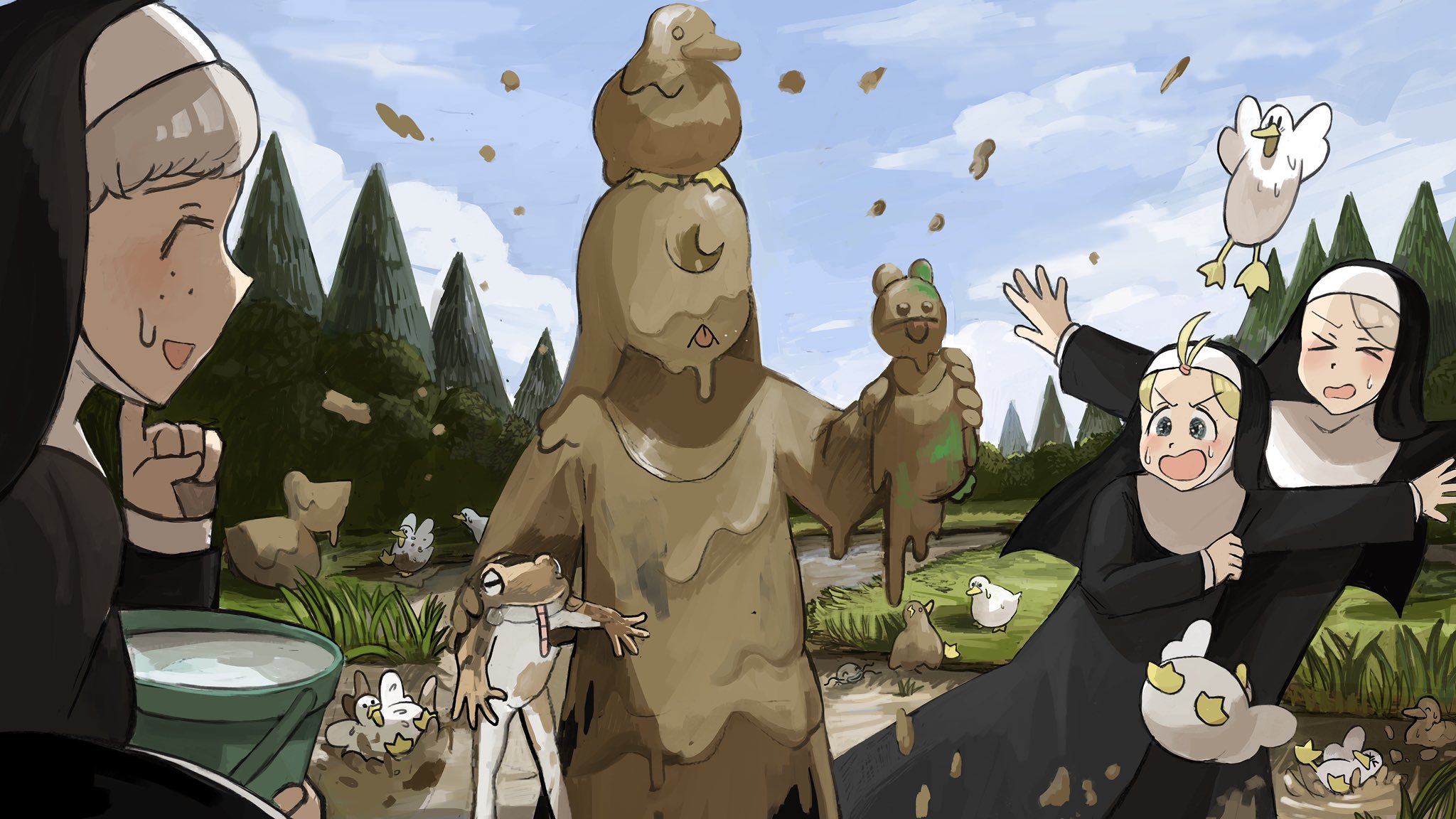 >_< 4girls :d ^_^ animal animal_on_head bangs_pinned_back bird bird_on_head blonde_hair blue_eyes bucket bucket_of_water bush catfish chicken closed_eyes cloud clumsy_nun_(diva) commentary dirty dirty_clothes dirty_face diva_(hyxpk) doll duck eating english_commentary falling finger_to_cheek fish freckles frog froggy_nun_(diva) grass grey_hair habit highres holding holding_animal holding_bucket leaf leaf_nun_(diva) little_nuns_(diva) mud multiple_girls nun nun_headdress on_head open_mouth outdoors outstretched_arm outstretched_arms pelican playing rubber_band scared scratching_cheek sheep_nun_(diva) sky slice_of_life smile splashing spread_arms spread_wings tongue tongue_out topknot traditional_nun tree wading wetland worm