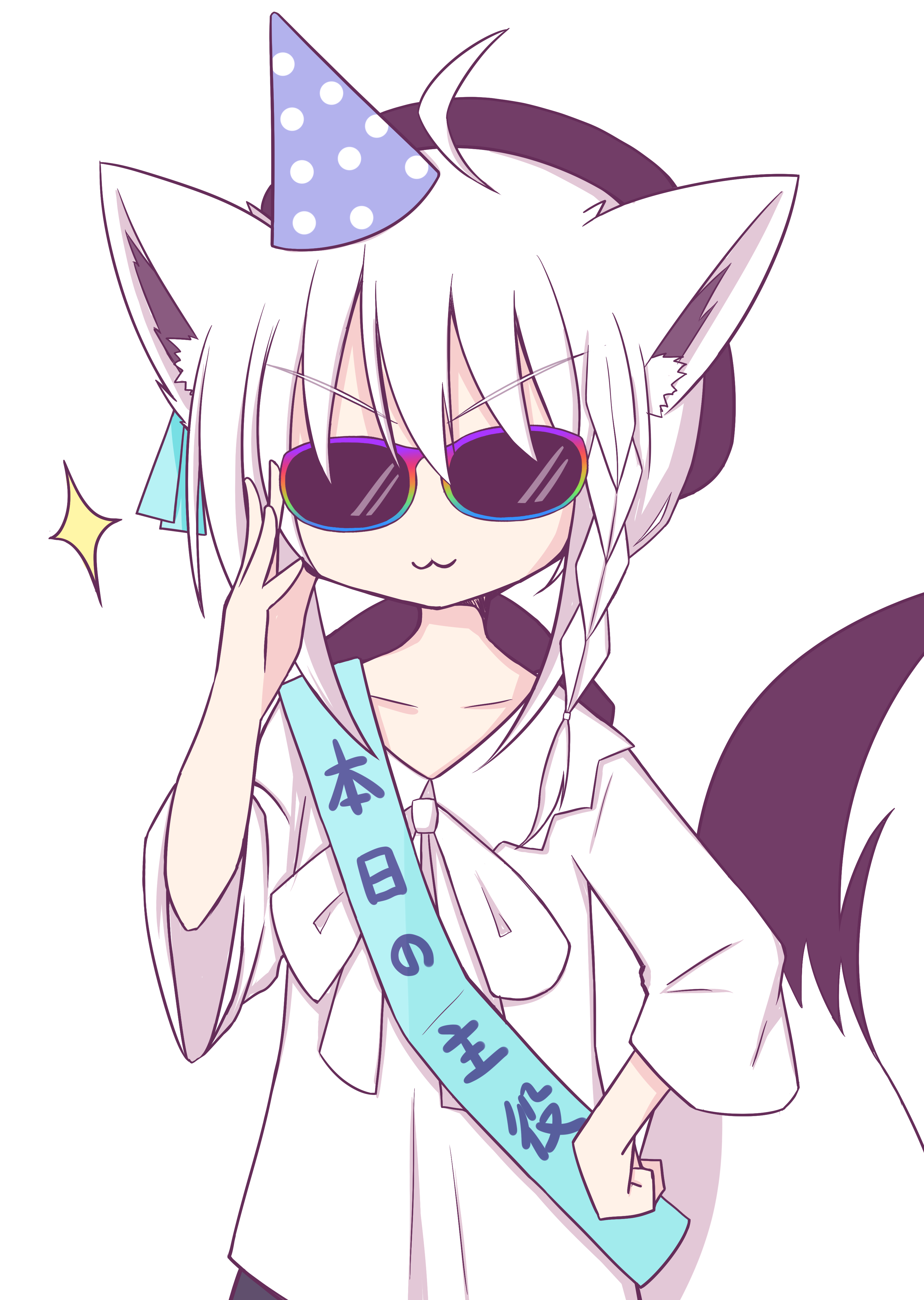 1girl :3 absurdres adjusting_eyewear animal_ears beret black_bow black_hair bow braid collarbone commentary_request fox_ears fox_girl fox_tail hair_between_eyes hair_bow hand_on_own_hip hat highres hololive kurasesu long_hair long_sleeves party_hat shirakami_fubuki shirakami_fubuki_(street) shirt sidelocks simple_background single_braid solo sparkle sunglasses tail v-shaped_eyebrows virtual_youtuber white_background white_hair white_shirt