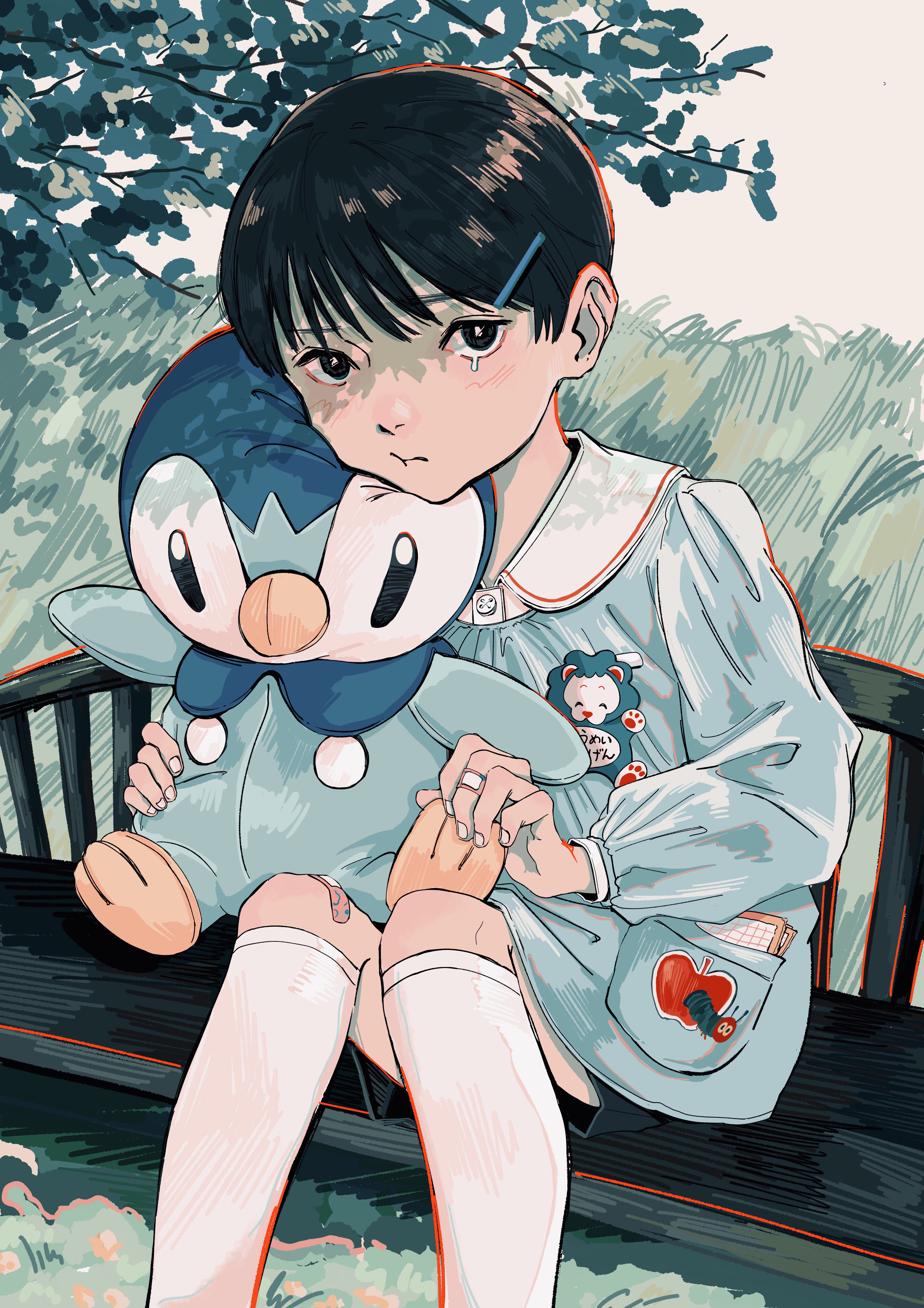 1girl absurdres apple bandaid bandaid_on_hand bandaid_on_knee bandaid_on_leg bench black_hair black_shorts blue_shirt caterpillar character_doll child commentary_request day doll feet_out_of_frame food fruit gen_4_pokemon grass hair_ornament hairclip highres kindergarten_uniform kneehighs long_sleeves looking_at_viewer nintendo original outdoors piplup pokemon pokemon_(creature) pout shirt short_hair shorts sitting smock socks solo stuffed_animal stuffed_penguin stuffed_toy tearing_up the_very_hungry_caterpillar tomei_ningen tree white_socks