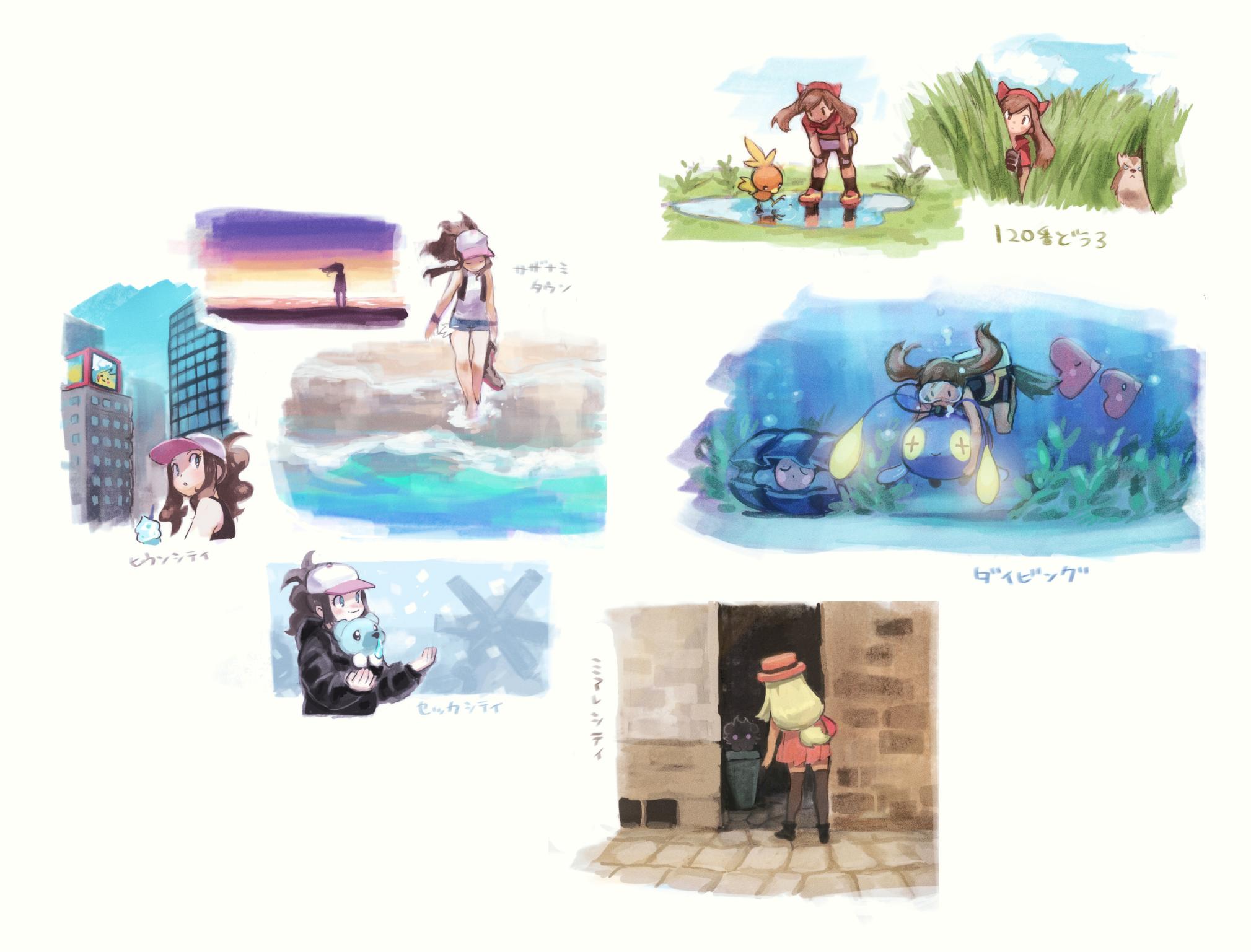 3girls air_bubble alley alternate_costume bandana bare_arms baseball_cap bike_shorts black_footwear black_hoodie black_vest blonde_hair blue_eyes blush boots brown_hair brown_legwear bubble burakku_mutou chinchou clamperl closed_eyes closed_mouth commentary_request cubchoo espurr eyelashes furret gen_2_pokemon gen_3_pokemon gen_5_pokemon gen_6_pokemon gloves glowing goggles grass hat highres hilda_(pokemon) hoenn_route_120 holding holding_boots holding_footwear holding_pokemon holding_unworn_clothes hood hoodie leaning_forward long_hair luvdisc may_(pokemon) multiple_girls multiple_views nintendo pleated_skirt pokemon pokemon_(creature) pokemon_black_and_white pokemon_ruby/sapphire/emerald pokemon_x_and_y puddle red_bandana red_shirt serena_(pokemon) shirt shoes short_sleeves sidelocks skirt smile socks standing tall_grass thighhighs torchic translation_request underwater unworn_boots vest wading water white_skirt