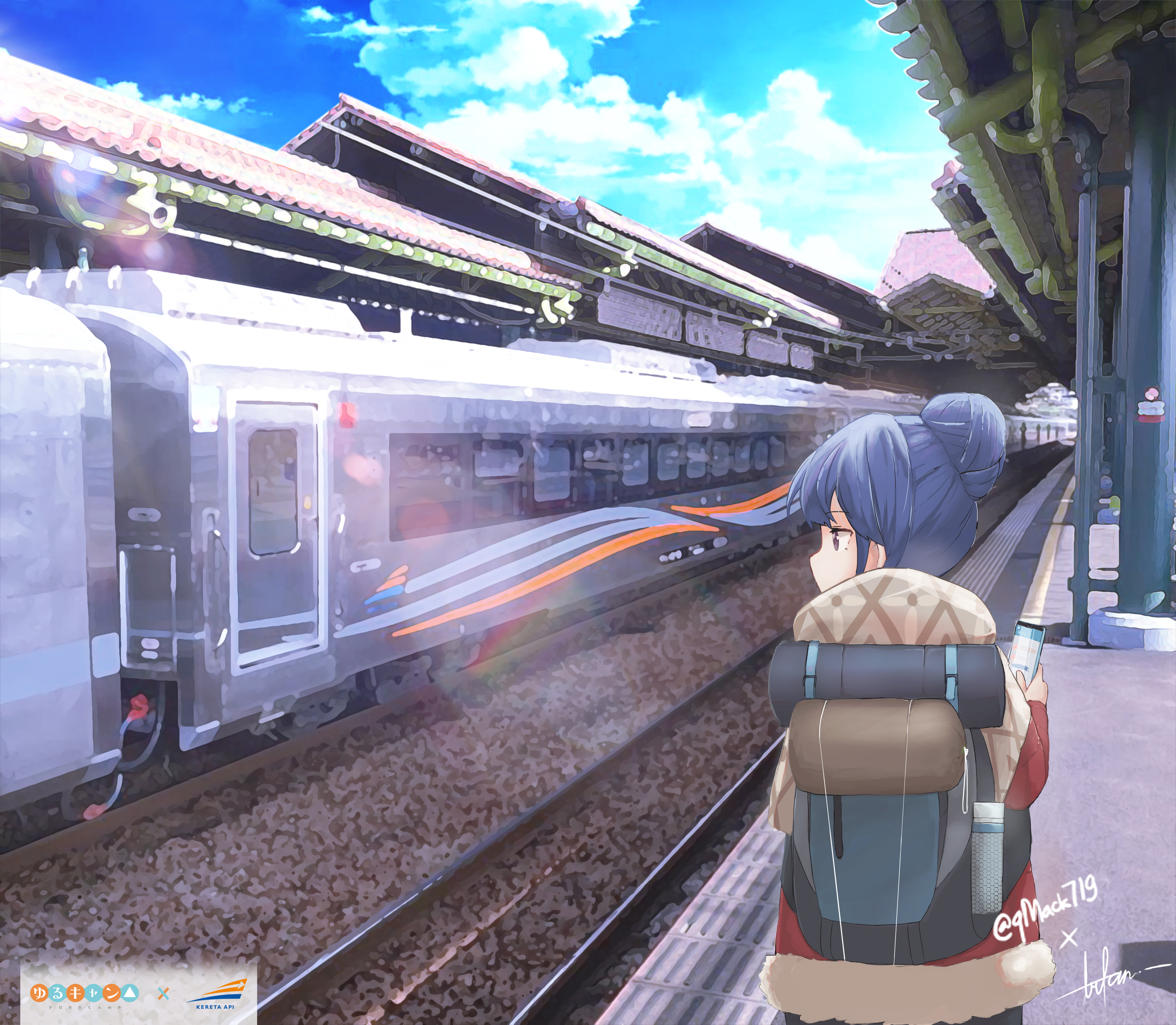 1girl absurdres backpack bag blue_hair blue_jacket blue_sky cellphone cloud copyright_name day from_behind hair_bun highres holding holding_phone jacket jknor lens_flare outdoors phone purple_eyes railroad_tracks rooftop shawl shima_rin sidelocks signature single_hair_bun sky smartphone solo standing train train_station train_station_platform upper_body vanishing_point yurucamp
