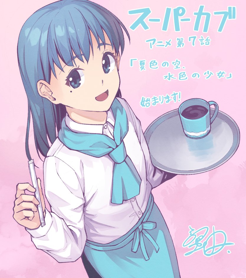 1girl apron blue_apron blue_eyes blue_hair blue_neckwear collared_shirt copyright_name cowboy_shot cup drinking_straw eniwa_shii event_follow-up holding kanini looking_at_viewer mole mole_under_eye mug official_art open_mouth pink_background promotional_art shirt signature smile solo super_cub tray white_shirt