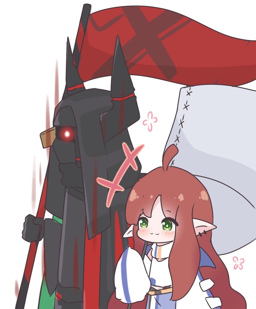 +++ 1girl 1other :3 ahoge ambiguous_gender arknights black_coat blue_skirt chibi coat commentary demon_horns ear_piercing english_commentary flag glowing glowing_eyes green_eyes holding holding_flag hood horns kurotofu long_hair long_sleeves myrtle_(arknights) oversized_clothes piercing pointy_ears red_hair sarkaz_sentinel_(arknights) scarf shirt simple_background skirt sleeves_past_wrists upper_body very_long_hair white_background white_scarf white_shirt