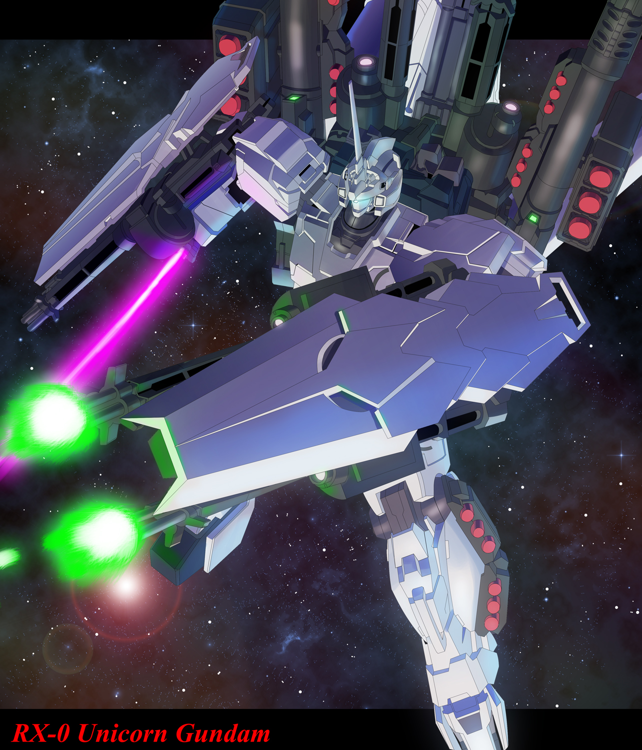 arm_cannon energy_sword firing full_armor_unicorn_gundam gundam gundam_unicorn highres holding holding_sword holding_weapon horns looking_down mecha mecha_focus missile_pod moyashi_(karamisouma) robot science_fiction shield single_horn solo sword unicorn_gundam visor weapon