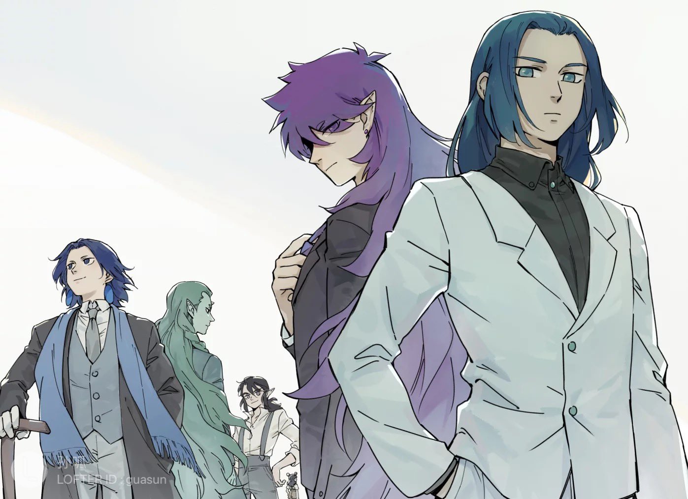5boys alternate_costume black_hair black_jacket black_shirt blue_hair blue_scarf cane collared_shirt diting_(the_legend_of_luo_xiaohei) earrings fengxi_(the_legend_of_luo_xiaohei) formal_clothes green_hair grey_neckwear grey_vest guagua_sun hand_in_pocket horns jacket jewelry lanxi_zhen laojun_(the_legend_of_luo_xiaohei) lofter_username long_hair multiple_boys necktie nezha_(the_legend_of_luo_xiaohei) pointy_ears profile purple_hair scarf shirt single_horn suit suspenders luo_xiaohei_zhanji very_long_hair vest white_background wuxian_(the_legend_of_luo_xiaohei) xuan_li_(the_legend_of_luoxiaohei)