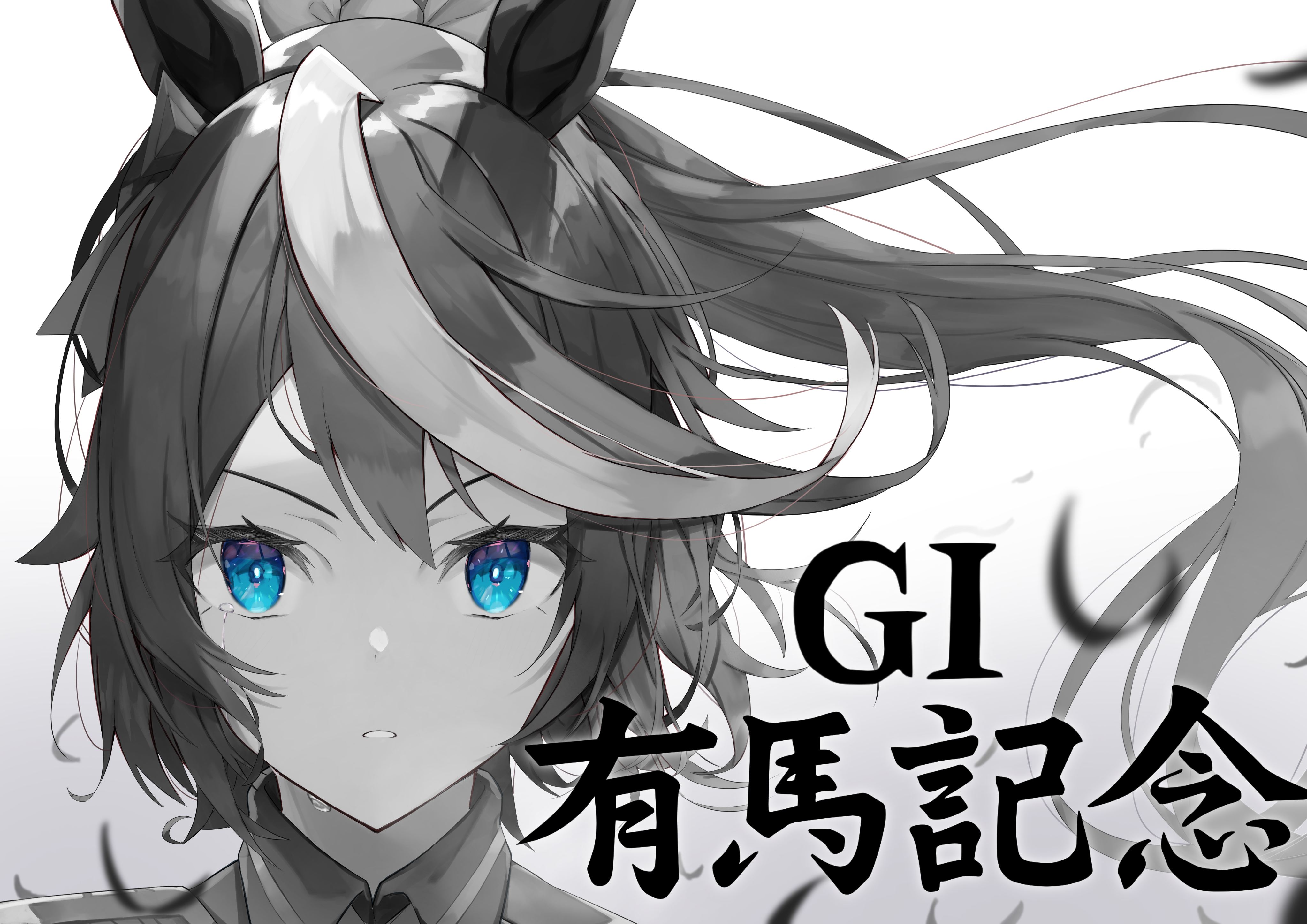 1girl absurdres animal_ears blue_eyes bow close-up crying crying_with_eyes_open gradient_background greyscale hair_bow high_ponytail highres horse_ears horse_girl kuroshiro_kanae long_hair monochrome multicolored_hair parted_lips ponytail portrait solo spot_color streaked_hair tears tokai_teio_(peak_joy)_(umamusume) tokai_teio_(umamusume) two-tone_hair umamusume white_hair wind