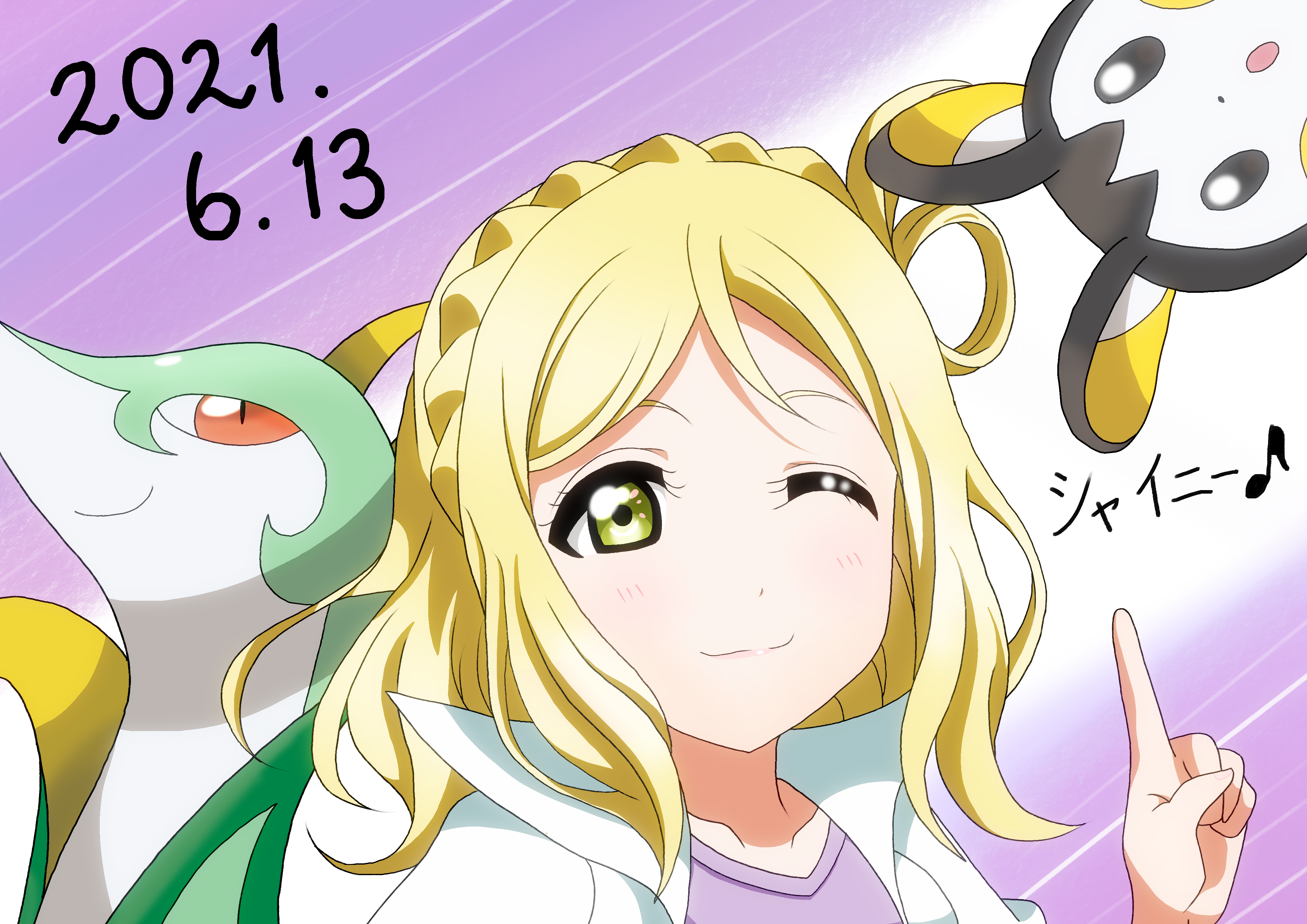 1girl ;) absurdres artist_name artist_request blonde_hair blush braid breasts brown_eyes collarbone crossover crown_braid emolga female_focus gen_5_pokemon green_eyes hair_rings highres jacket looking_at_viewer love_live! love_live!_sunshine!! nintendo ohara_mari one_eye_closed parted_lips pink_shirt pointing pointing_up pokemon pokemon_(creature) servine shirt short_hair smile solo upper_body white_jacket yellow_eyes