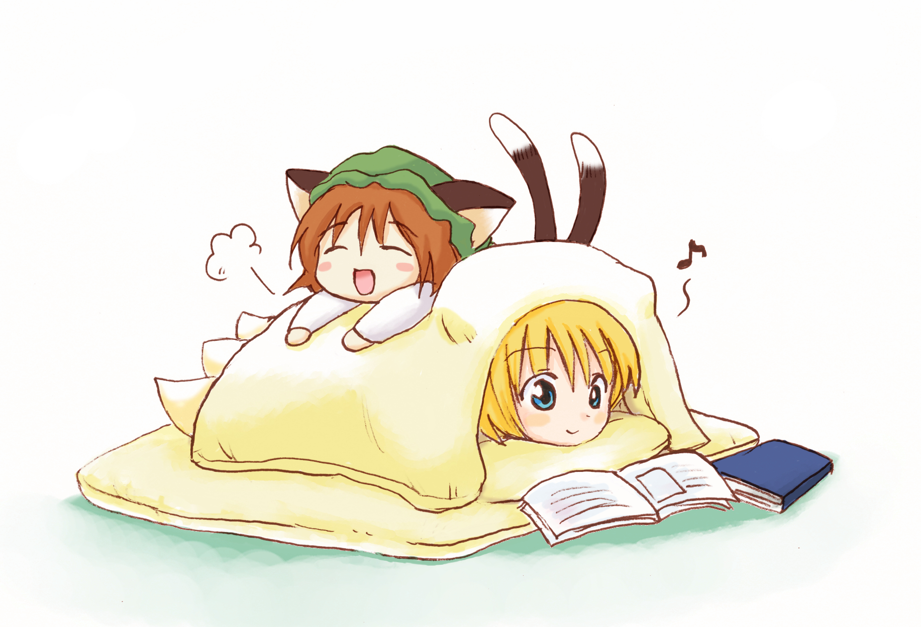 2girls bad_id bad_pixiv_id blanket blonde_hair blue_eyes blush_stickers book brown_hair chen chibi eijima_moko female_focus futon hat highres multiple_girls multiple_tails musical_note tail touhou white_background yakumo_ran