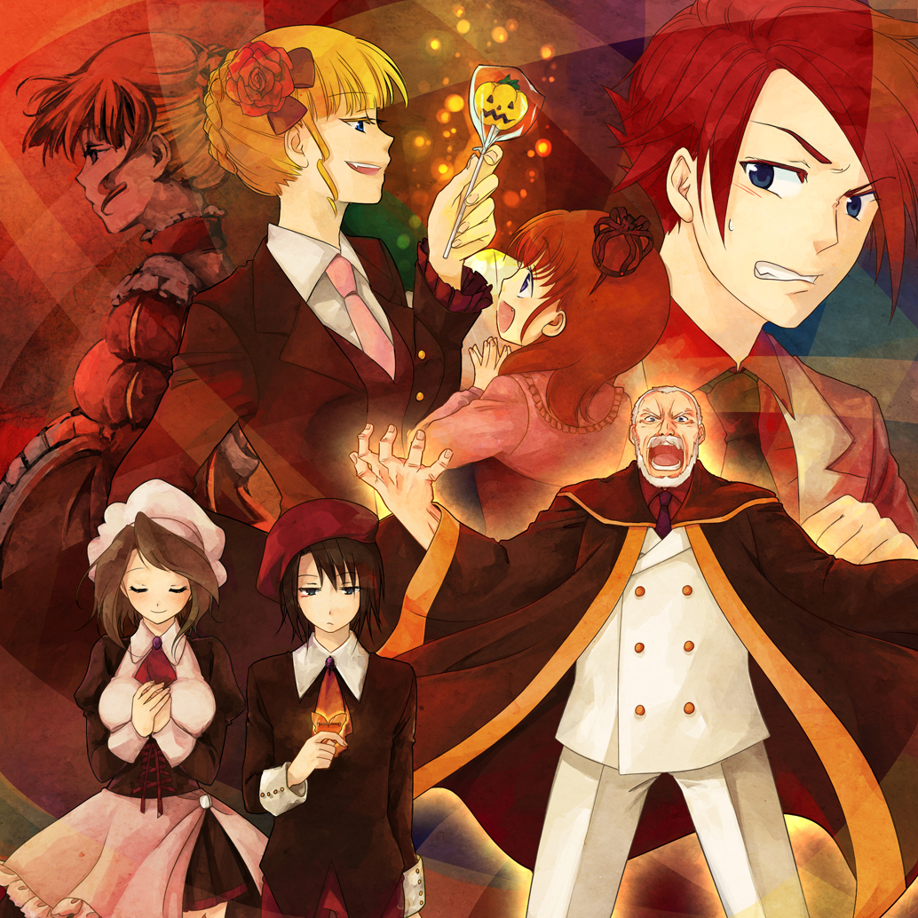 00s 3boys 3girls apron beatrice_(umineko) beret black_hair brown_hair bug butterfly candy cape clenched_teeth closed_eyes corset crown dress dual_persona evil_smile expressionless flower food formal_clothes hair_flower hair_ornament hat insect kanon_(umineko) lollipop multiple_boys multiple_girls necktie old old_man own_hands_clasped own_hands_together pink_necktie pumpkin red_flower red_rose rose sasae shannon_(umineko) short_hair smile suit teeth umineko_no_naku_koro_ni ushiromiya_battler ushiromiya_kinzou ushiromiya_maria