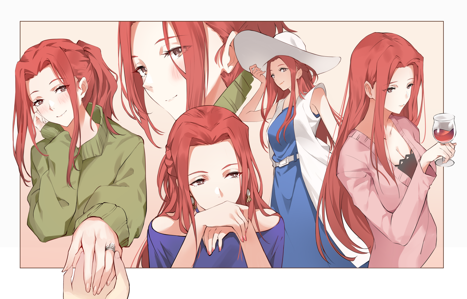 1girl alcohol brown_eyes cup cynthia_moore drinking_glass great_pretender green_sweater hat highres jewelry moore_cynthia nr_noir ornate_ring red_hair ring sun_hat sweater wedding_ring wine wine_glass