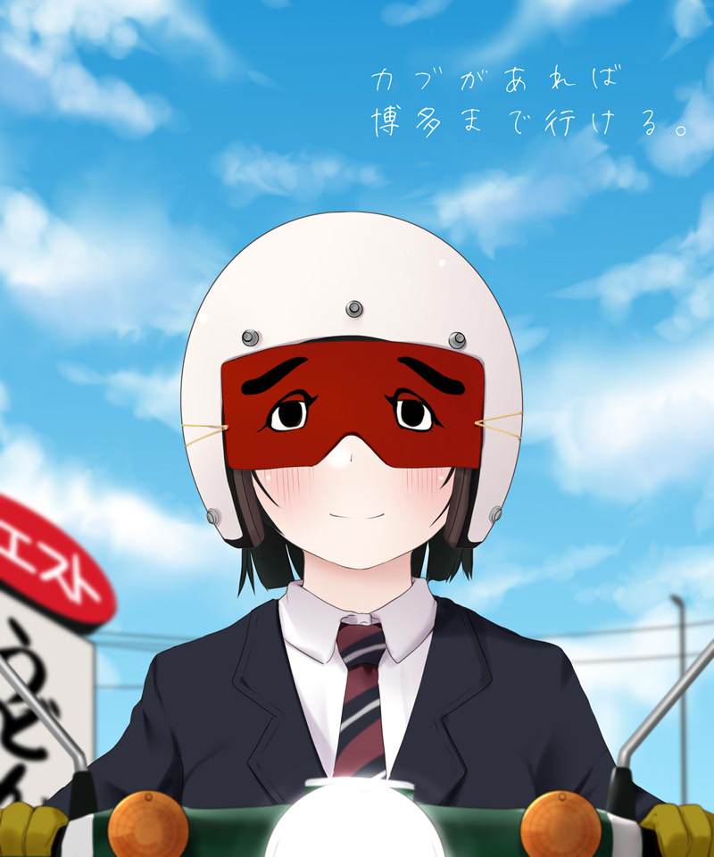 1girl black_hair black_jacket blazer blue_sky blurry blurry_background blush closed_mouth cloud collared_shirt commentary_request day depth_of_field diagonal-striped_clothes diagonal-striped_necktie diagonal-striped_neckwear facing_viewer helmet honda_super_cub jacket koguma_(super_cub) kozue_akari lamppost mask necktie outdoors power_lines shirt short_hair sky smile solo striped_clothes striped_necktie striped_neckwear super_cub translation_request upper_body white_headwear white_shirt