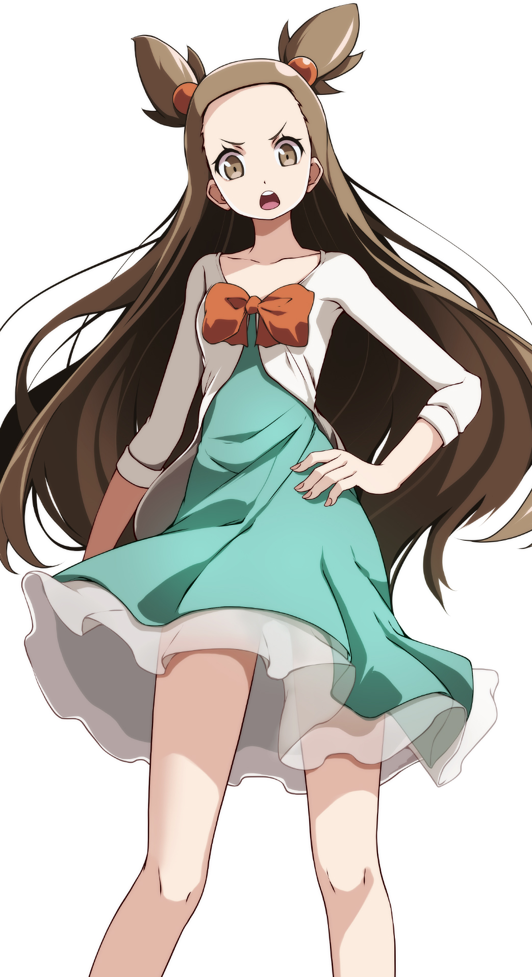 1girl brown_eyes brown_hair collarbone dress fingernails green_dress gym_leader hand_on_own_hip highres jasmine_(pokemon) legs long_hair long_sleeves looking_at_viewer nintendo open_mouth pokemon pokemon_heartgold_and_soulsilver simple_background solo standing teeth tsukishiro_saika upper_teeth_only white_background