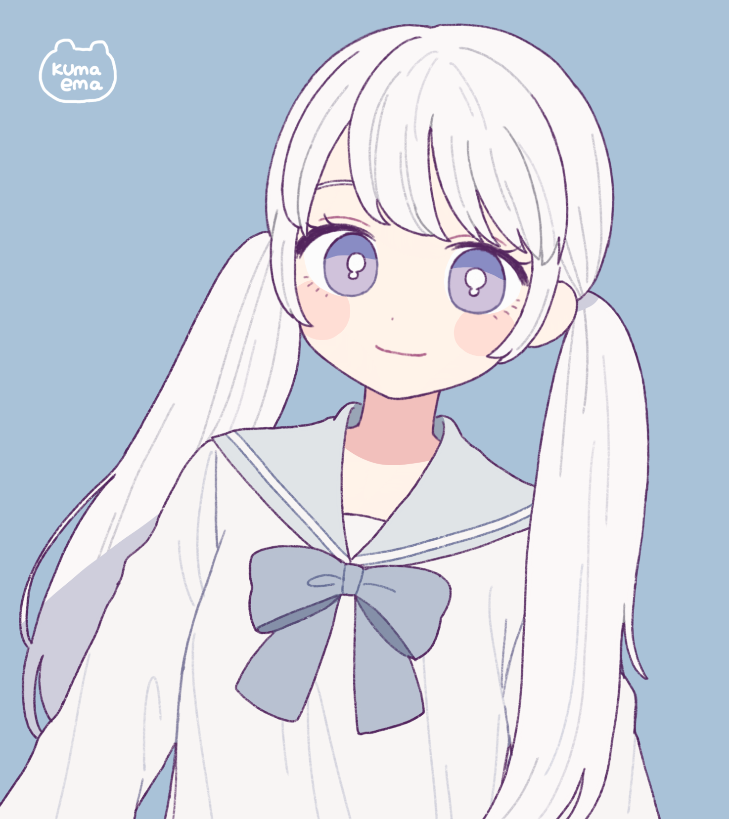 1girl blue_background blush bow bright_pupils emma_(kumaema) grey_bow grey_neckwear grey_sailor_collar highres long_hair long_sleeves looking_at_viewer original purple_eyes sailor_collar shadow signature simple_background smile solo twintails upper_body white_hair white_pupils