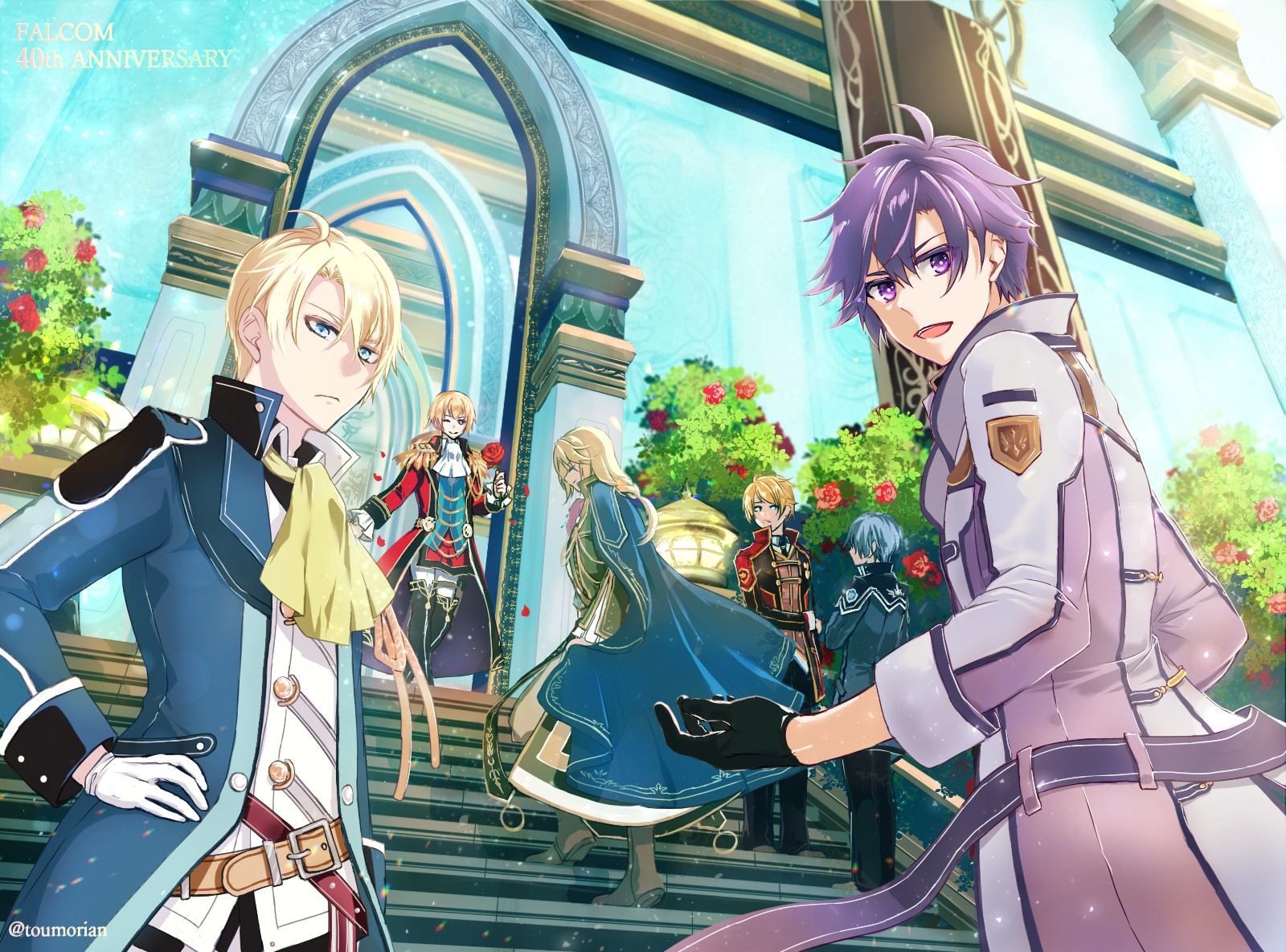 6+boys anniversary ascot banner belt belt_buckle black_gloves blonde_hair blue_eyes blue_hair boots buckle cape cedric_reise_arnor closed_eyes closed_mouth coat collar collared_jacket eiyuu_densetsu english_text epaulettes eyebrows eyelashes falcom flower formal_clothes frilled_sleeves frills frown gate gloves green_coat hair_between_eyes hand_on_arm hand_on_own_hip highres holding holding_flower jacket jusis_albarea kurt_vander lantern light_particles long_hair looking_at_another male_focus military military_uniform multiple_boys olivert_reise_arnor one_eye_closed open_mouth petals plant ponytail prince purple_eyes purple_hair rean_schwarzer red_coat rose rufus_albarea school_uniform sen_no_kiseki sen_no_kiseki_(series) sen_no_kiseki_i sen_no_kiseki_iii short_hair siblings stairs standing toumorian twitter_username white_gloves wink