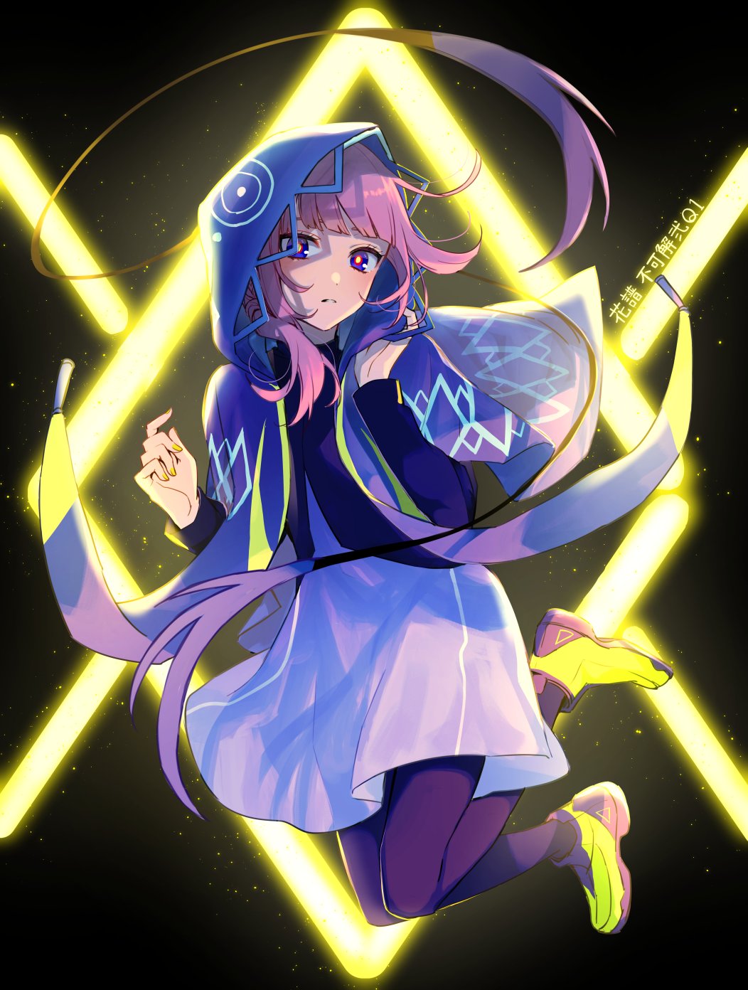 1girl capelet dress full_body hakuri highres hood hood_up hooded_capelet kaf_(kamitsubaki_studio) kamitsubaki_studio long_sleeves looking_at_viewer medium_hair multicolored_eyes nail_polish pantyhose parted_lips pink_hair side_ponytail solo two-tone_background virtual_youtuber yellow_nails yellow_pupils