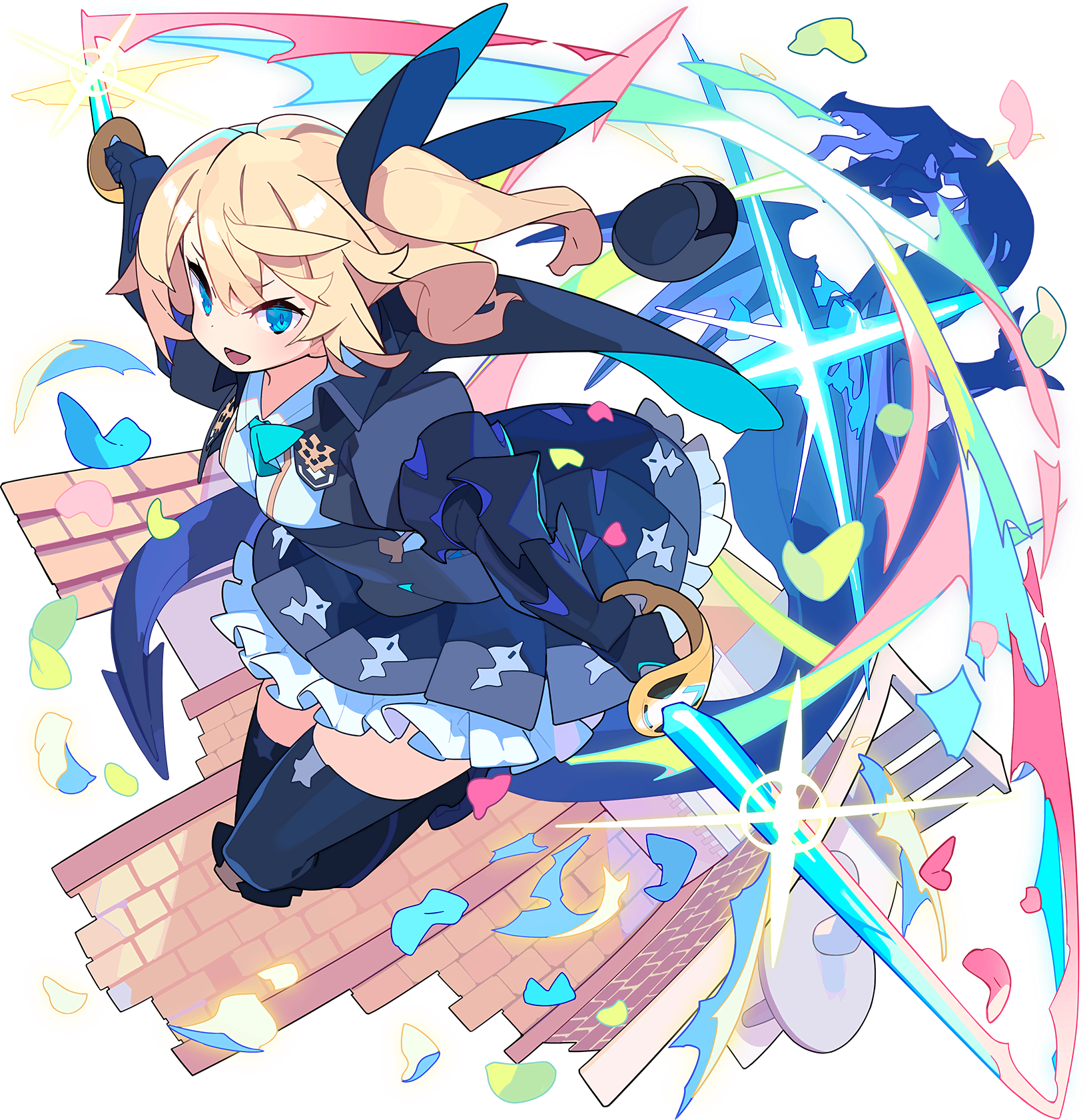 1girl artist_request ascot black_cape black_gloves black_headwear black_jacket black_ribbon black_skirt black_thighhighs blonde_hair blue_ascot blue_eyes blush breasts cape celtie_(world_flipper) collared_jacket collared_shirt cropped_jacket dragon dual_wielding dutch_angle female_focus frilled_skirt frills full_body gauntlets glint gloves hair_ribbon happy hat unworn_hat unworn_headwear highres holding holding_sword holding_weapon jacket light_blush long_hair looking_at_viewer looking_to_the_side miniskirt non-web_source official_art one_side_up open_mouth outdoors outstretched_arms petals pleated_skirt puffy_sleeves ribbon running shirt skirt small_breasts smile solo_focus sword thighhighs transparent_background two-sided_cape two-sided_fabric v-shaped_eyebrows weapon white_shirt world_flipper zettai_ryouiki
