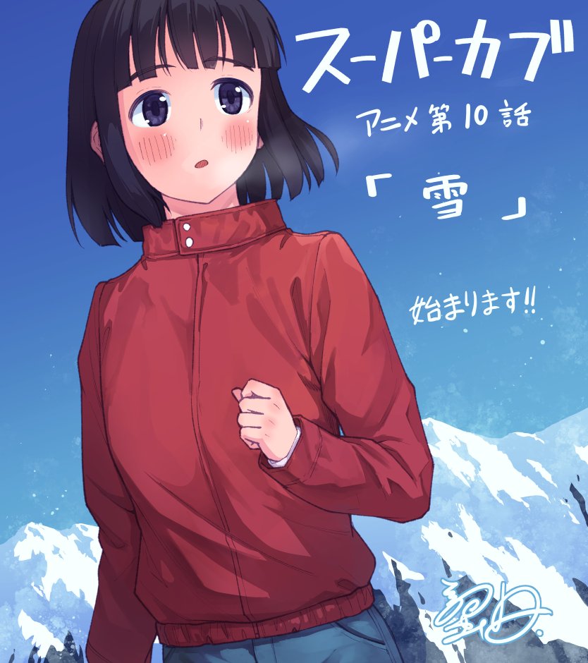 1girl black_eyes black_hair blue_sky blush copyright_name denim event_follow-up jacket jeans kanini koguma_(super_cub) long_sleeves mountain official_art open_mouth pants promotional_art red_jacket short_hair signature sky snow solo super_cub upper_body