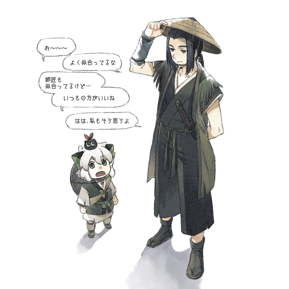 2boys animal_ears arm_up black_hair cat_boy cat_ears child hand_on_headwear hat luo_xiaohei luo_xiaohei_(human) luo_xiaohei_zhanji multiple_boys open_mouth shadow short_sleeves simple_background smile speech_bubble sword translation_request triple_bambi weapon white_background white_hair wuxian_(the_legend_of_luo_xiaohei)