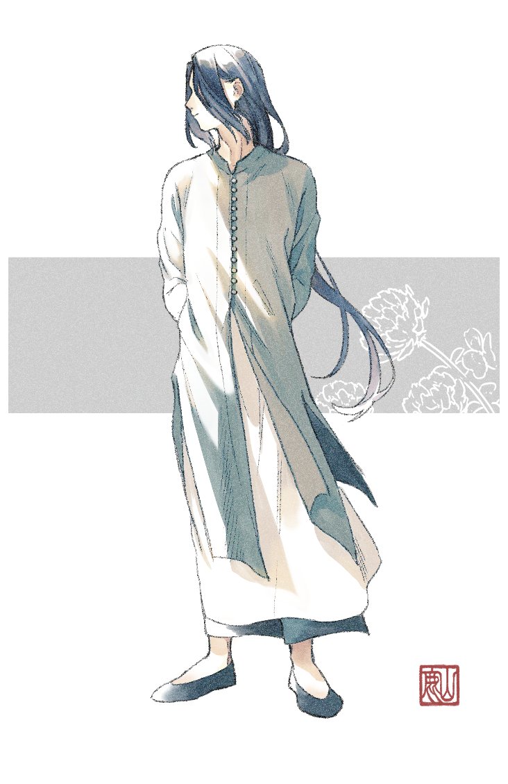 1boy alternate_costume arms_behind_back black_hair black_shoes full_body long_hair long_sleeves luo_xiaohei_zhanji profile shoes solo standing triple_bambi very_long_hair wuxian_(the_legend_of_luo_xiaohei)