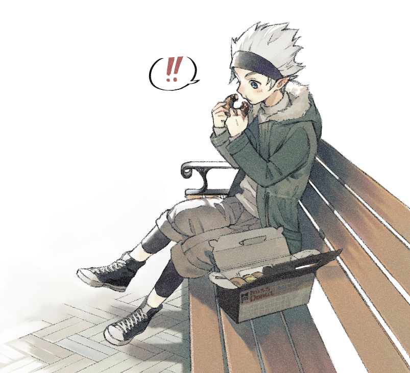 ! !! 1boy bench black_eyes black_hairband black_shoes eating fur_trim green_jacket grey_pants hairband hood hooded_jacket jacket long_sleeves luo_xiaohei_zhanji pants pointy_ears shoes sitting solo speech_bubble spoken_exclamation_mark triple_bambi white_hair yi_feng_(the_legend_of_luoxiaohei)