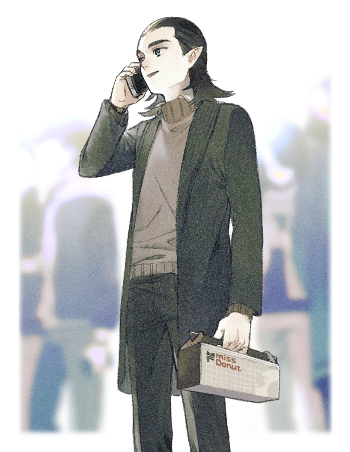 1boy black_hair black_jacket black_pants brown_sweater cowboy_shot guan_xuan_(the_legend_of_luoxiaohei) holding holding_phone jacket medium_hair open_mouth pants phone pointy_ears smile solo standing sweater talking_on_phone luo_xiaohei_zhanji triple_bambi