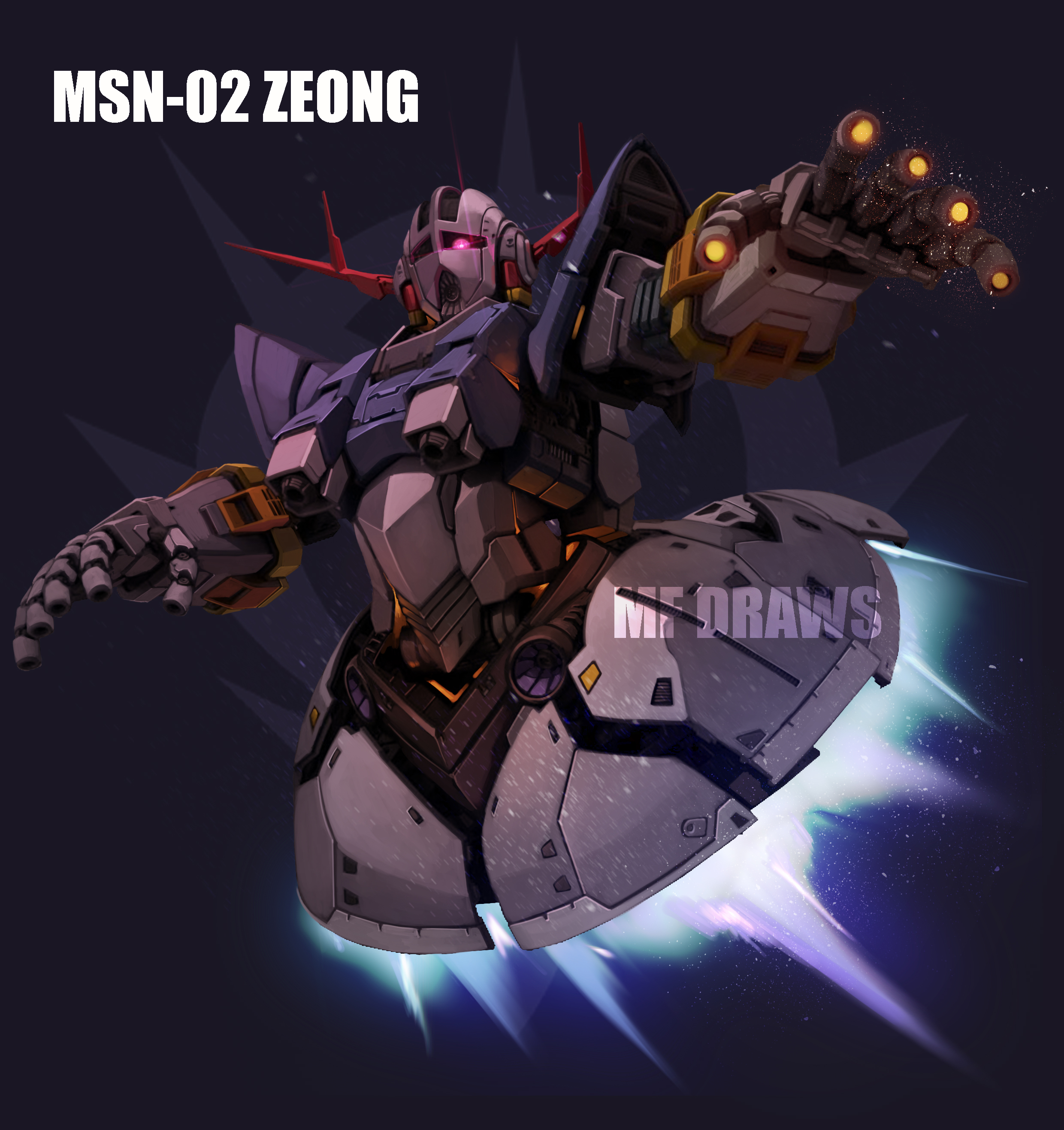 absurdres artist_name character_name flying glowing glowing_eye gundam highres mecha mecha_focus mf_draws mobile_suit_gundam no_humans one-eyed open_hands pink_eyes robot solo space watermark zeon zeong
