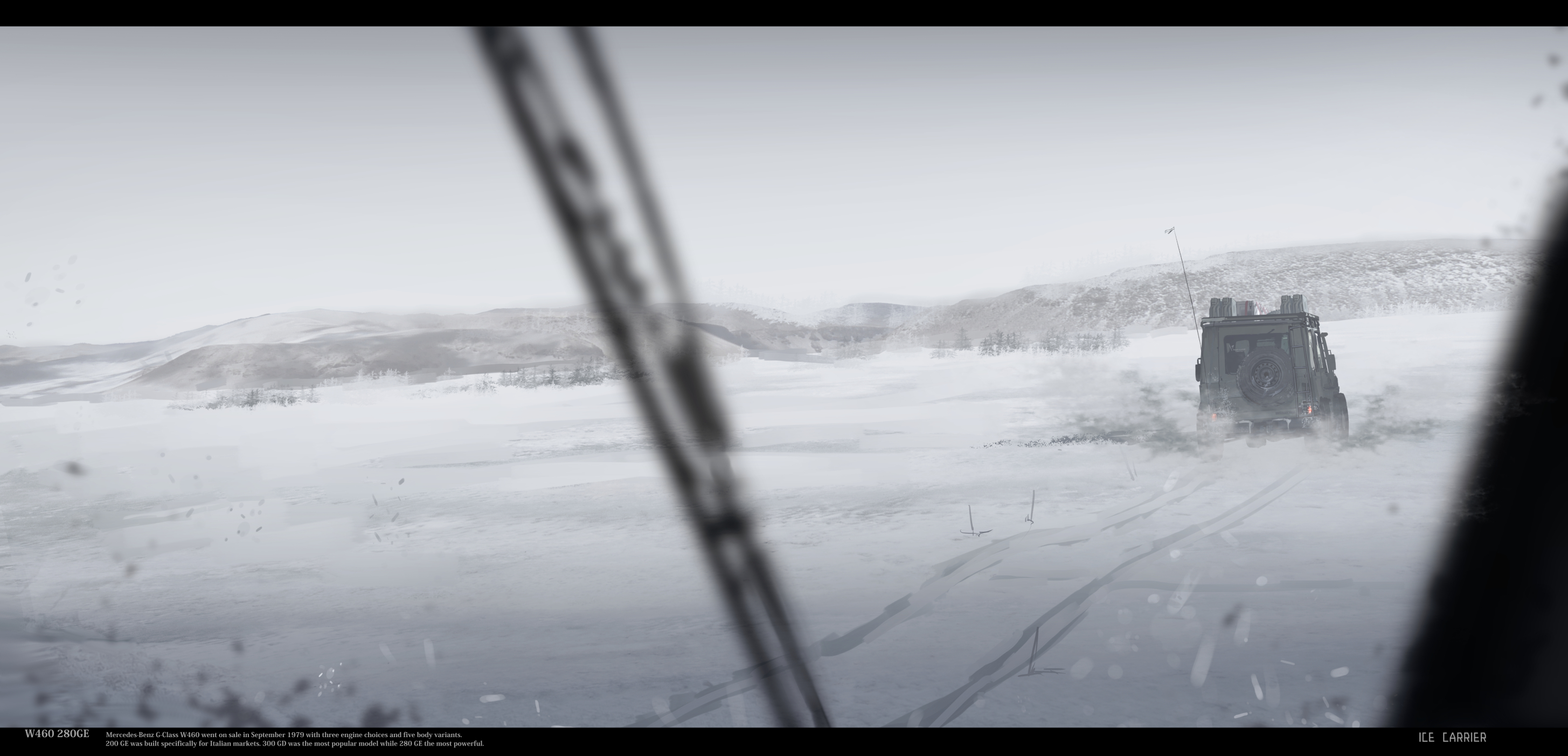 car daria_(haguruma_c) english_text haguruma_c highres letterboxed maz-537 military motor_vehicle mountainous_horizon original scenery snow sports_utility_vehicle tree viveka_(haguruma_c) windshield wipers