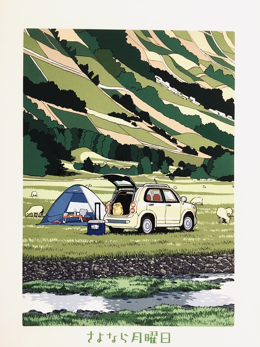 car cooler grass gundam gundam_thunderbolt highres motor_vehicle no_humans official_art ohtagaki_yasuo scenery sheep stream tent tree vehicle_focus