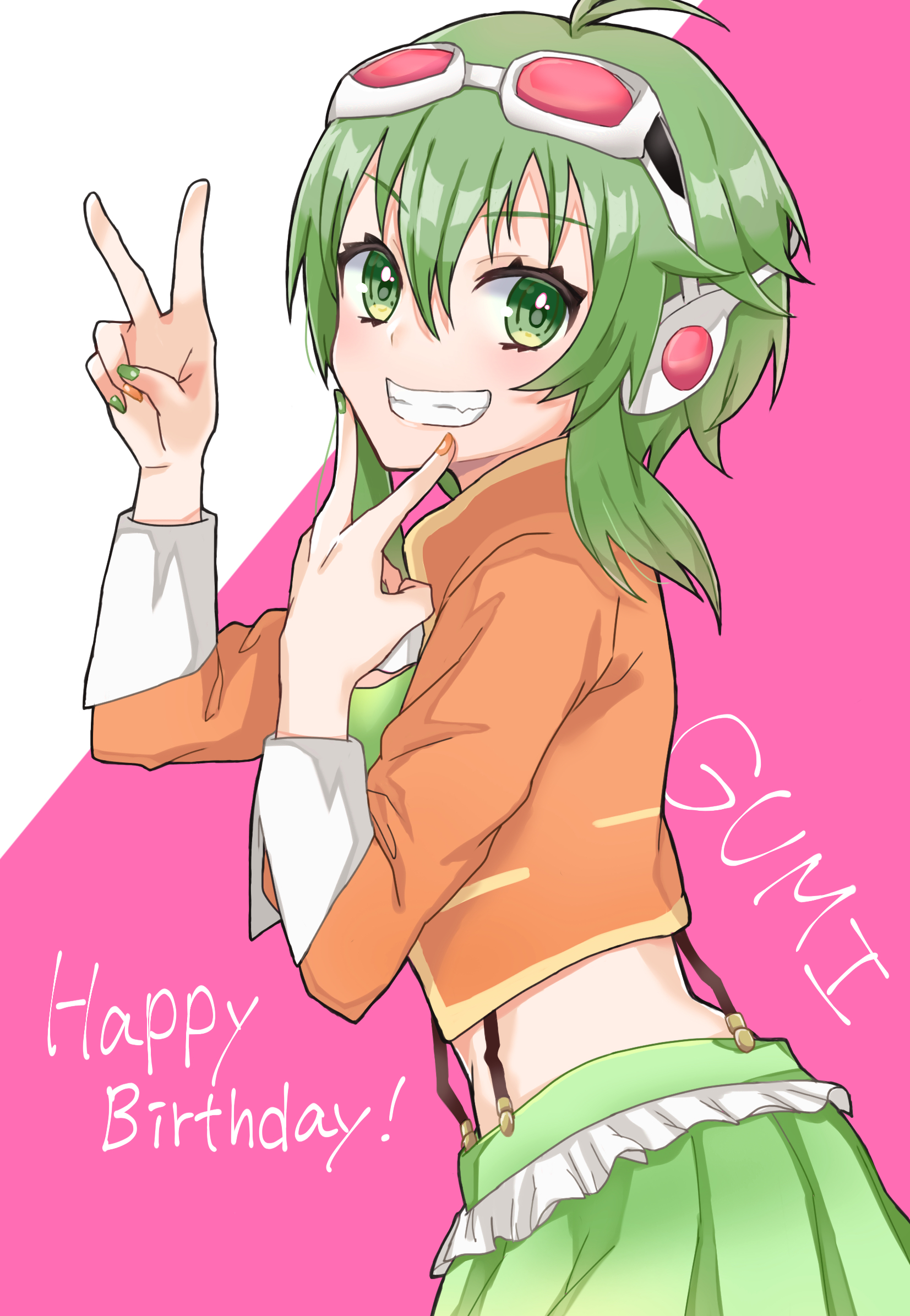 1girl ahoge aonamisan character_name commentary double_v fingers_to_chin from_side goggles goggles_on_head green_eyes green_hair green_nails green_skirt green_tube_top grin gumi hand_on_own_chin hand_up happy_birthday headphones highres jacket looking_at_viewer looking_to_the_side gumi_(v3_megpoid) multicolored_nails nail_polish orange_jacket orange_nails pleated_skirt red_goggles short_hair_with_long_locks sidelocks skirt smile strapless suspender_skirt suspenders tube_top v vocaloid