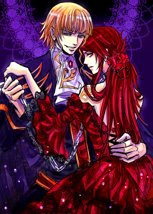 00s 1boy 1girl ascot bad_id bad_pixiv_id beatrice_(umineko) blonde_hair blue_eyes chain collar couple dress flower frills genderswap genderswap_(ftm) genderswap_(mtf) hetero kaoru leash red_eyes red_hair rose tattoo umineko_no_naku_koro_ni ushiromiya_battler