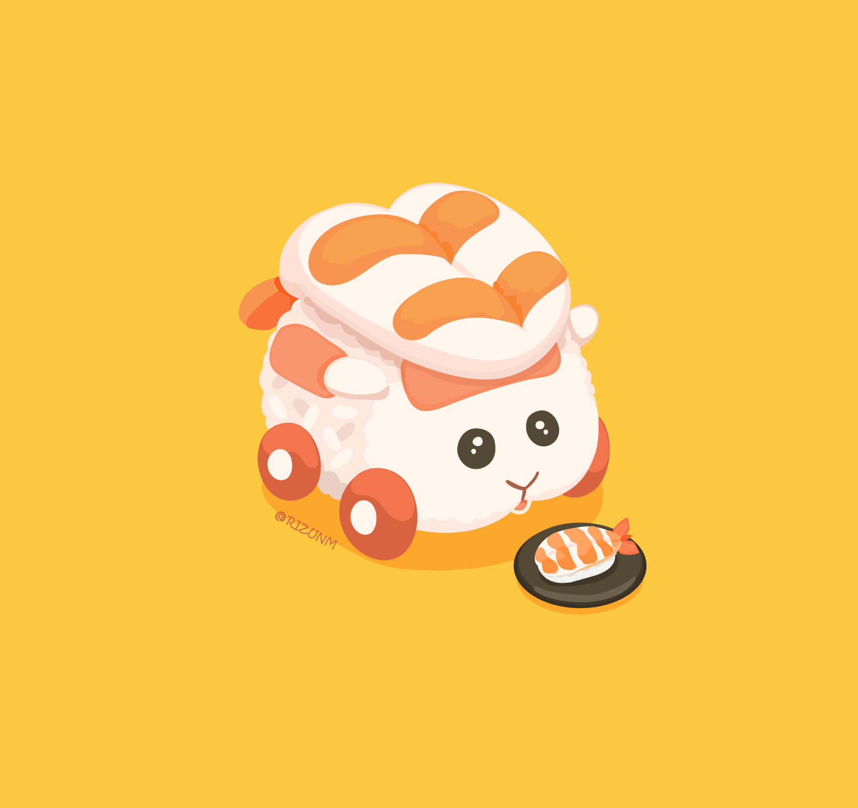artist_name black_eyes fish fish_(food) food food_on_head full_body highres looking_down molcar nigirizushi no_humans object_on_head open_mouth plate pui_pui_molcar rice rizu_(rizunm) simple_background sushi sushi_molcar twitter_username watermark yellow_background